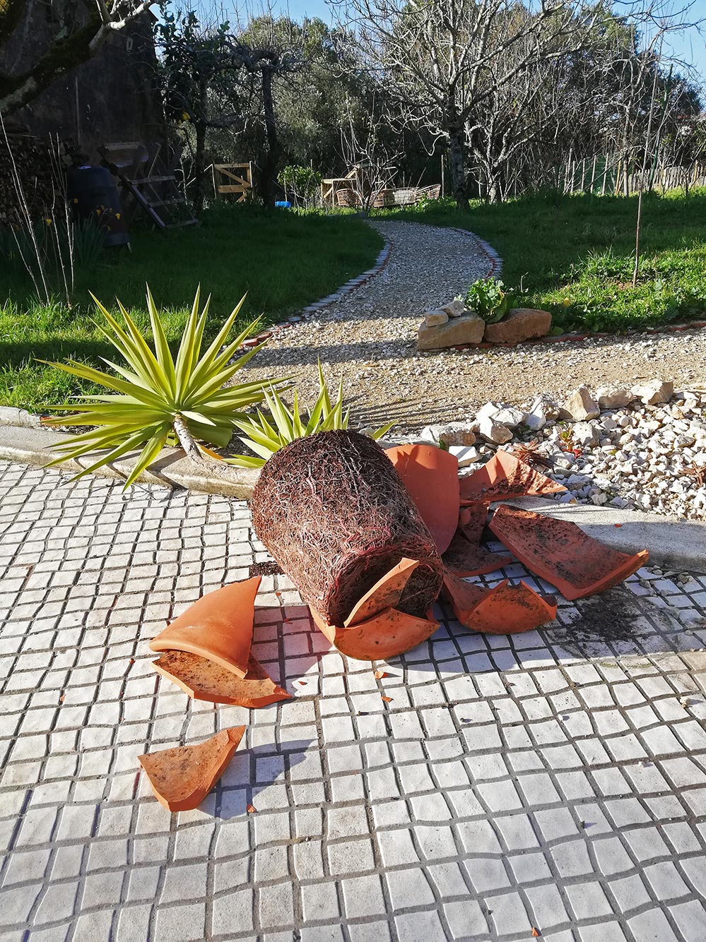 Het heeft flink gewaaid in Portugal. Lang niet zo erg als in Nederland waar Eunice aardig heeft huisgehouden. De storm valt hier reuze mee, het was wel een koude, harde wind en het voelde onprettig aan zodra de zon onder ging, maar je kon het nog geen storm noemen. Voor de yucca was het toch te veel, die ving te veel wind en doordat de bovenkant meer wind vangt dan de onderkant ging de plant om. De pot waar die instond was er niet tegen bestand en viel stuk op het terras. Gelukkig is dat de enige schade. Er zijn wat stoelen omgewaaid, maar dat is het dan wel. Niet te vergelijken met wat er in Nederland is gebeurd.