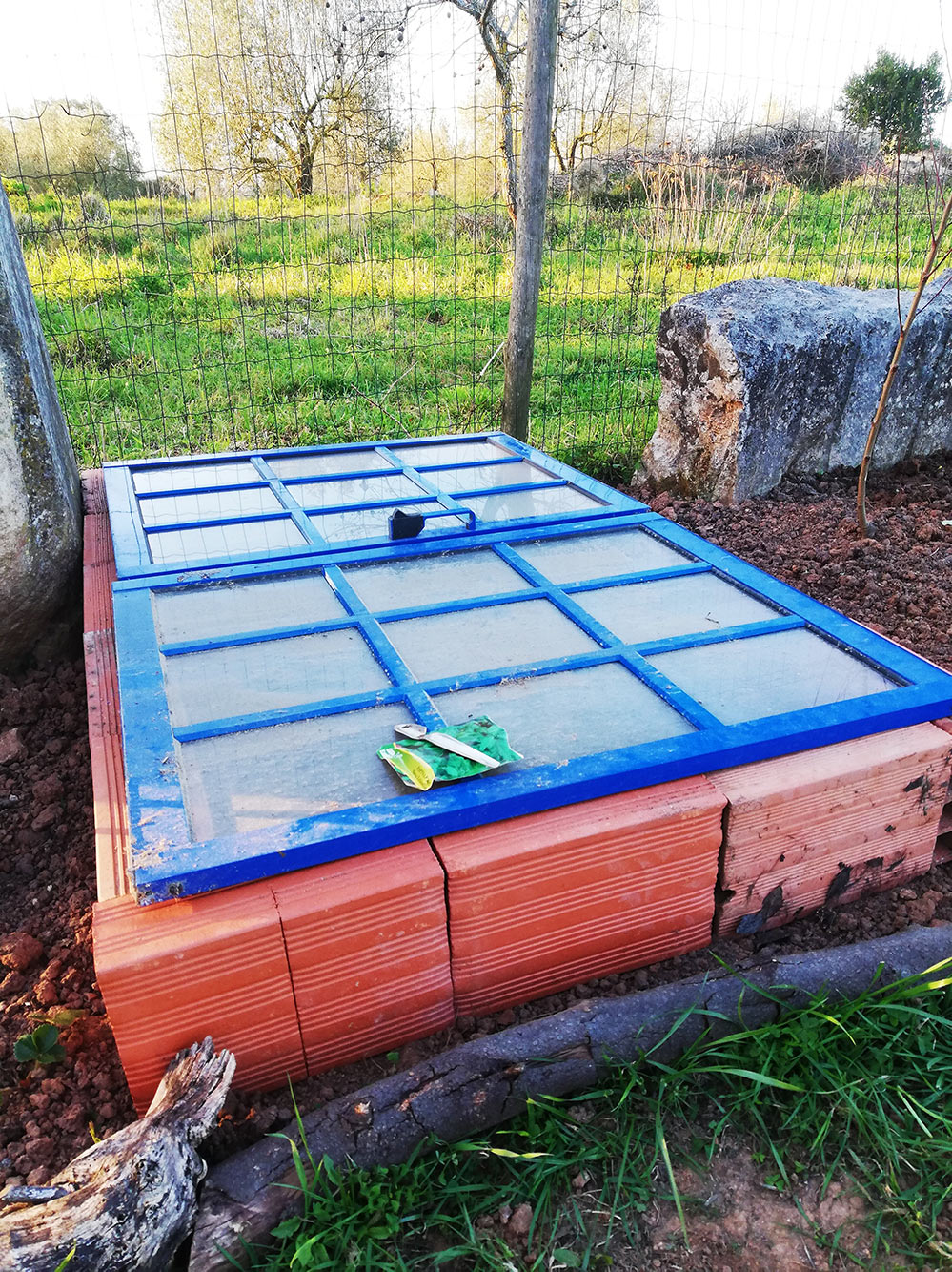 Handiger is als ze buiten staan bij elkaar, maar dan moeten ze wel een beetje beschermd staan. Met wat terracotta stenen en de oude ramen van het huis is er zo een kas gemaakt. Past mooi in de moestuin en met de hulp van Camille was het zo gepiept. Nu de zaaibakjes verzamelen die hier en daar opgestapeld zijn en we zijn klaar voor het begin van misschien wel een prachtige oogst.