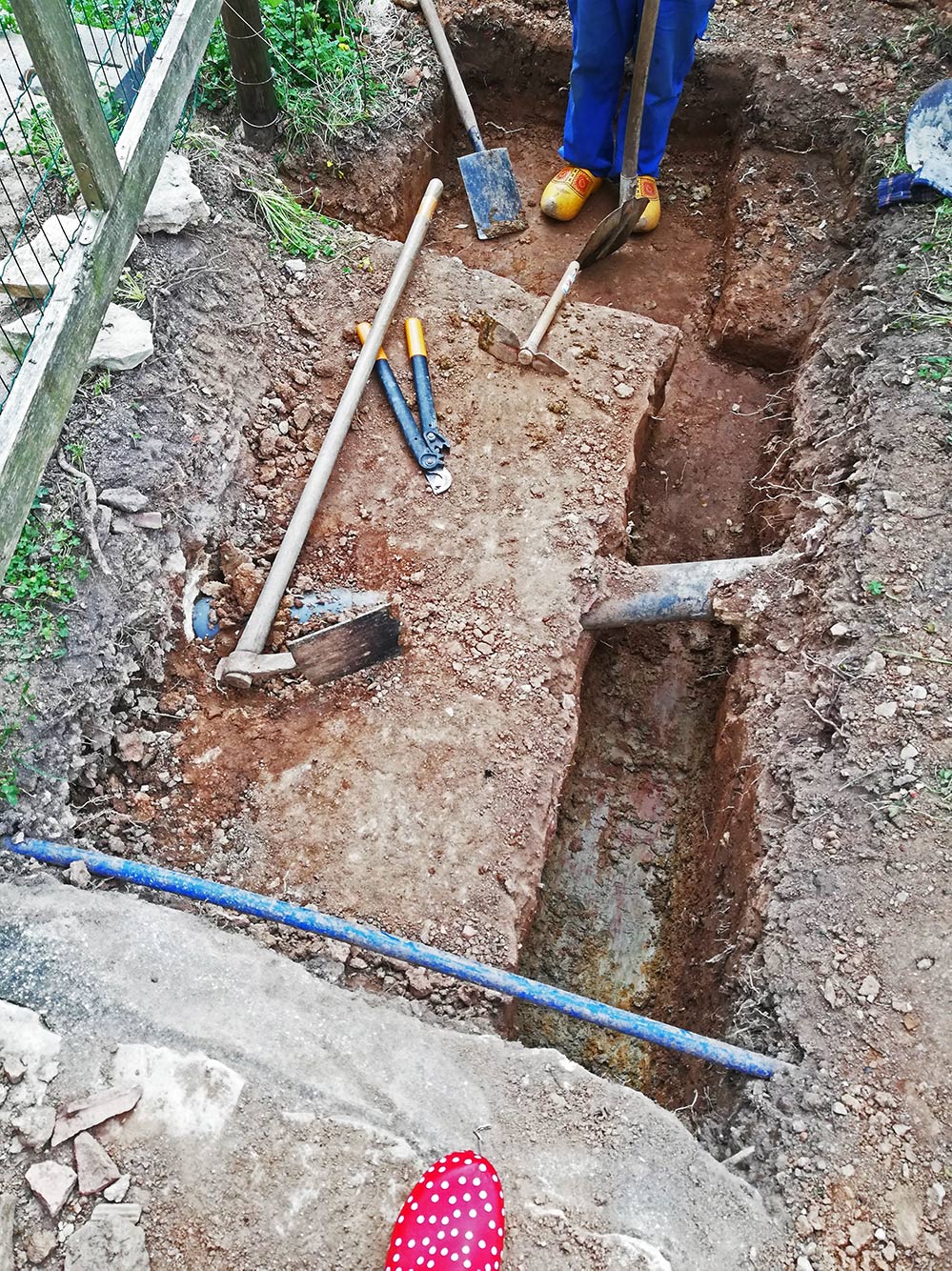 Het lijken wel opgravingen die we hier aan het doen zijn. Maar nee, we zijn bezig het laatste stukje terras, of eigenlijk het stukje dat het pad langs het appartement gaat verbinden met het pad dat achterlangs het huis loopt, of moet gaan lopen. Want dat laatste is nog niet klaar, dat gaan we in een keer doen. Eerst het fundament van het laatste stukje, dan weer puin erop, zand, brita en uiteindelijk een laag cement en tegels. Maar zover zijn we nog niet. Eerst uitgraven voor het fundament. Eigenlijk is het een beetje diep, maar het moet aansluiten op wat we eerder gemaakt hebben en dat was ook zo diep. ’t Kost een beetje graafwerk, maar de grond is nog relatief zacht en dan gaat het wel.
