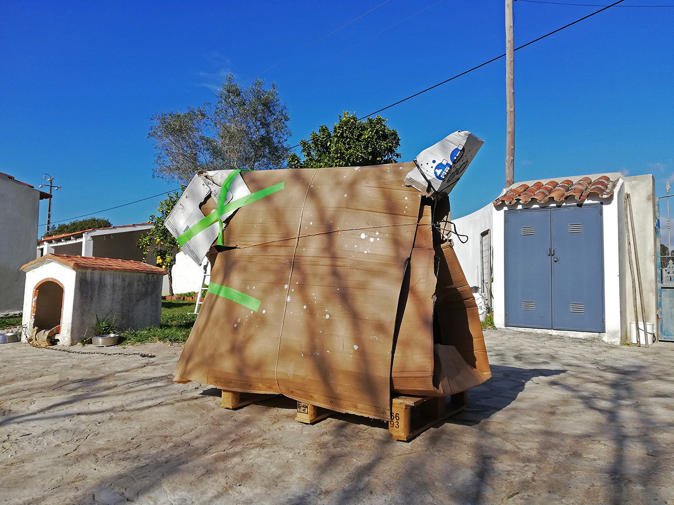 Dan maar terug. Gelukkig wordt het door het bedrijf waar het gekocht is ook weer opgehaald. Het moet alleen goed verpakt worden. De oorspronkelijke verpakking is natuurlijk weg, dus dan maar een beetje improviseren. ’t Ziet eruit als een verkleed monster, maar ach, het is toch carnaval.
