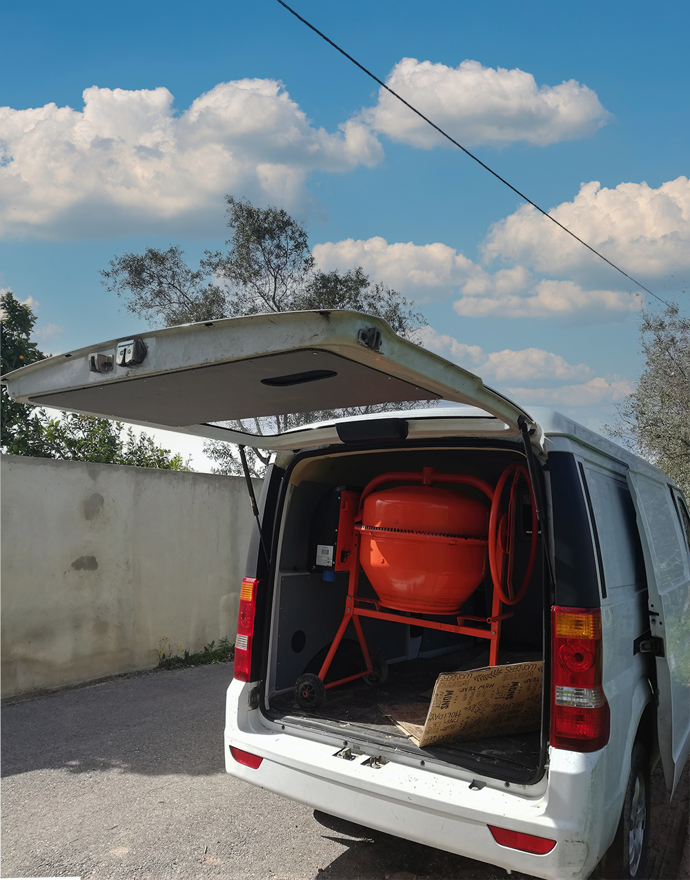 Het metselwerk is klaar, de molen, geleend van een goede vriend, kan weer terug. Toen de molen gehaald werd konden we hem met zijn tweeën in de bus hijsen. Nu was dat meer een probleem, want alleen is dat nog een hele klus. Maar je wordt vanzelf vindingrijker en door de molen eerst op één poot binnen te zetten lukte het net.