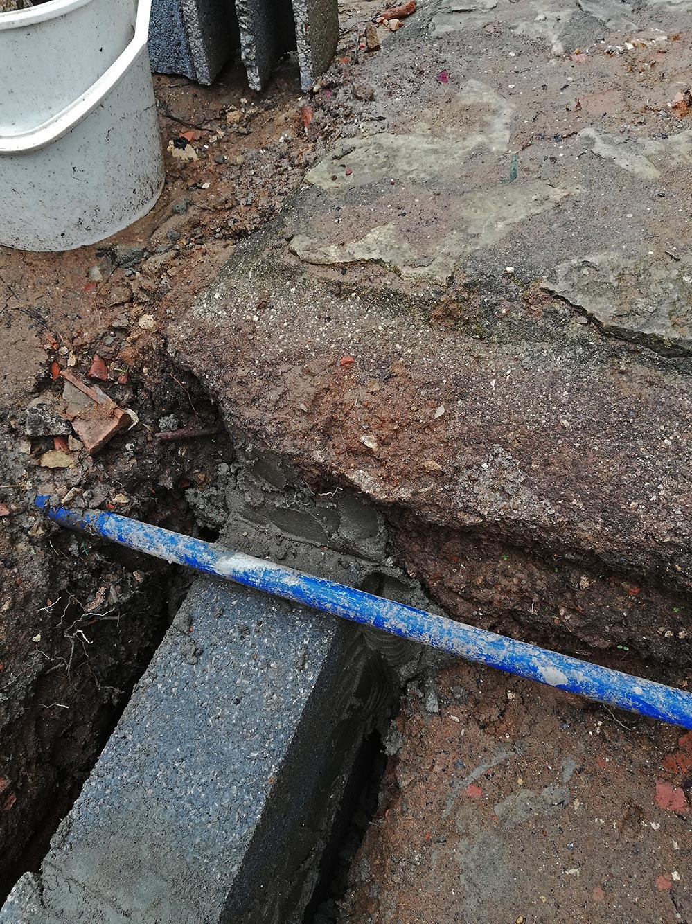 Altijd een mooi moment, als je een stuk dat je aan het maken bent kunt vastmaken aan een stuk dat er al was. Van de zomer zijn we begonnen aan het pad achterlangs het huis. Een paar weken terug zijn we begonnen met het graafwerk van het stukje tussen het pad langs het appartement en het pad achterlangs het huis. De betonnen strip fundament is maandag gelegd en stukje bij beetje is het muurtje opgemetseld, van die betonnen blokken. De onderste laag eindigt in de aarde en dus is er nog geen sprake van connectie, maar de tweede laag eindigt in de betonnen ondergrond van het pad en daar kan dan de verbinding worden gemaakt. Het is geen maancapsule die verbinding maakt met apollo-zoveel, maar het geeft wel even een klein gevoel van euforie.