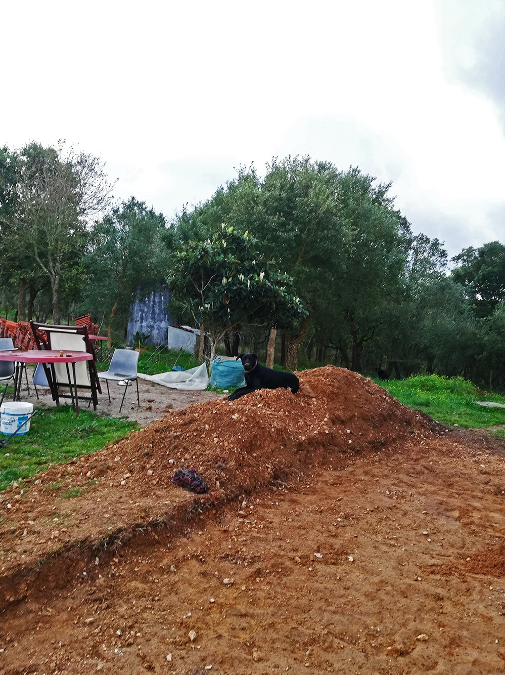 Voor het huis ligt een enorme berg zand. Het resultaat van Henri’s afgraafwerk. Het is eigenlijk niet voor te stellen dan van vijftien centimeter afgraven zo een berg kan ontstaan. Tomás maakt zich daar niet zo druk van, die vindt de berg prachtig als een soort troon. Als hij even niet met Milan aan het vechten is, gaat hij erbovenop liggen en houdt een beetje overzicht over het terrein. Als er binnen wat gebeurt gaat meteen zijn kop omhoog, want vanuit die positie kan hij het binnen ook een beetje in de gaten houden.