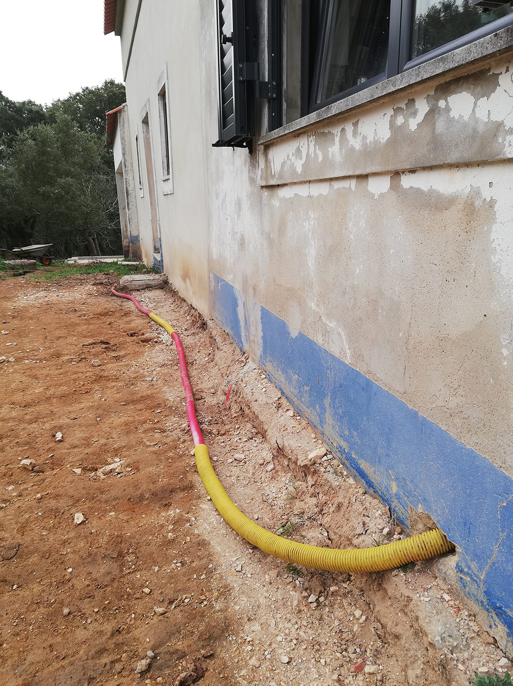 Het water dat wordt opgepompt gaat naar een groot vat en vandaar wordt het door de pomp het huis ingepompt. De waterleiding daarvoor lag grotendeels onder de grond, alleen het laatste stuk kwam boven om net in het zicht het huis in te gaan. Xarique had dat al eens ontdekt en een heel stuk van de leiding blootgelegd. Op zich niet zo erg, maar hij had ook lekker aan de mantel zitten knagen. Hele stukken waren daarom beschadigd. Gelukkig hadden we ergens nog een stuk mantel liggen. Ooit gebruikt om de elektriciteitskabel van het oude huis naar de schuur door te voeren. Dat stuk kwam nu mooi van pas. Nu Henri de boel uitgegraven heeft, komt een groot stuk waterleiding boven en kan het beschadigde stuk opnieuw ommanteld worden. Het stuk is voorzichtig in de lente doorgesneden en om de beschadigde mantel heen gelegd.