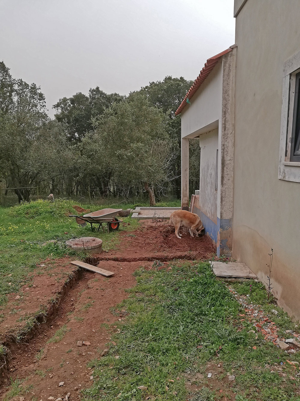 Henri werkt flink door aan wat het terras moet worden. Hij graaft af en maakt de geul waar uiteindelijk het fundament moet komen. ’t Laatste stuk voor het appartement moet wat lager worden doordat het terrein afloopt. Over de lengte van het huis, inclusief appartement en wat het terras aan de achterkant moet worden is het hoogteverschil rond de 1m60. Bijna een meter hebben we al opgelost door het terras aan de achterkant hoger te maken dan de grond eromheen. De rest moet met afstapjes overbrugd worden. Het laatste stuk bij het appartement moet zelfs een klein stukje opgehoogd worden. Daar is het dus meer grond verplaatsten en niet zozeer afgraven. Karma helpt schijnbaar met dat graafwerk, ze is af en toe verwoed in de grond aan het spitten. Waarschijnlijk hoort ze de veenmollen wegkruipen die uit hun winterslaap onder de grond opgeschrikt worden.