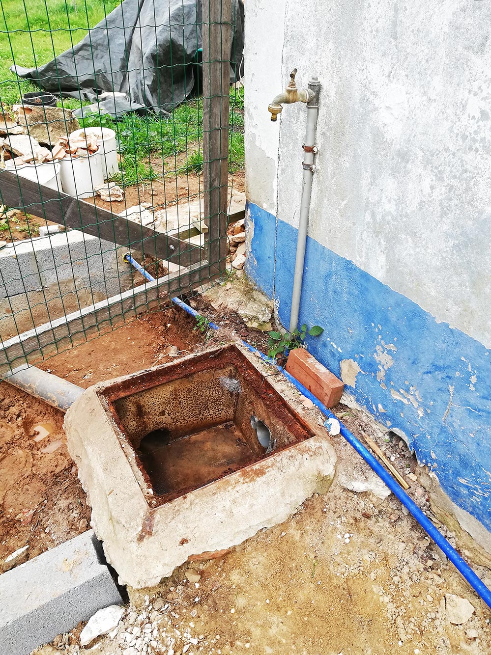 Bij de chinees een musketonhaak gekocht die je vast kunt schroeven. Daarmee was het deksel te bewegen. Gelukkig vonden we toen ook het lek. Waarschijnlijk lekte het al jaren, maar doordat het dertig centimeter onder de grond zat werd het nooit opgemerkt. Toch maar repareren, want je weet maar nooit. Even wachten tot Henri weg is, hij vertrekt morgen, dan kan het mooi drogen en kan het eenvoudig gerepareerd worden.