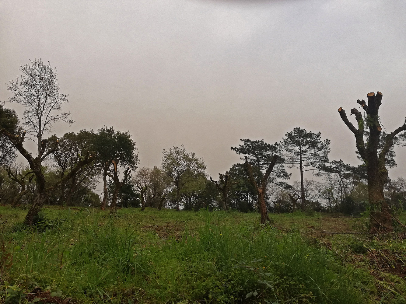 Eerst waren het maar een paar bomen die afgezaagd waren. Nu is het hele veld gedaan. Het ziet er een beetje surrealistisch uit al die kale bomen. De mannen hebben de losse twijgjes en kleine takjes verbrand en de grote stukken meegenomen. Wordt vast gebruikt als openhaardhout, maar dan moet het nog wel even drogen.