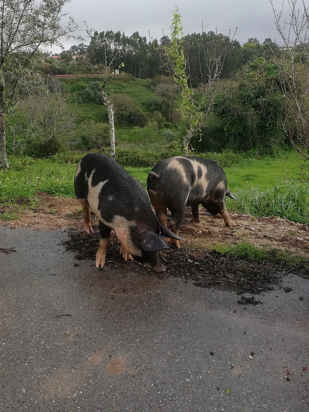 De geiten vinden het prettig als ze de wei in mogen. De varkens kennelijk ook als ze eens een ommetje kunnen maken. Het verschil is alleen dat dat niet de bedoeling is. De varkens zijn van de buren een stukje verderop. Ze hebben een stuk of vijf zeugen en af en toe tegen de veertig biggetjes. Zo af en toe ontsnappen ze en lopen vrolijk los.