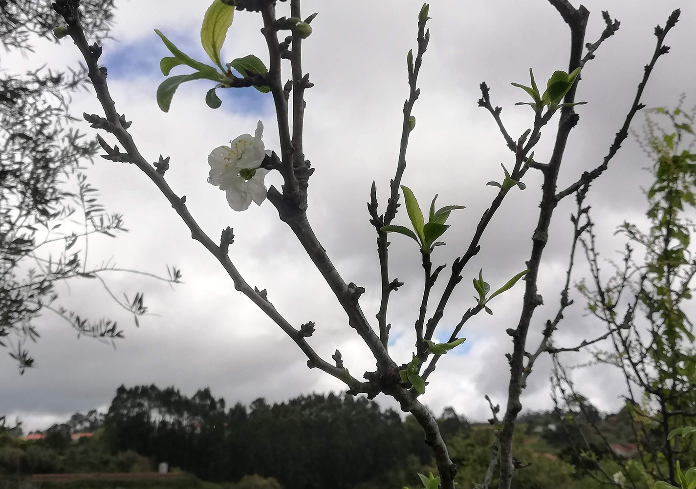 Langs het weggetje staan op ons stukje een stuk of twintig pruimenbomen. Dat klinkt veel maar het zijn eigenlijk kleine zaailingen van de pruimenbomen die er al eerder stonden. Of een wandelaar at pruimen en heeft de pitten hier uitgespuugd. Het zijn allemaal een beetje zielige boompjes, het zijn er ook eigenlijk te veel te dicht bij elkaar. Ze doen wel allemaal hun best, zonder uitzondering hebben ze minimaal één bloemetje, al is het boompje nog zo klein, als je een beetje kijkt vind je er altijd wel eentje.