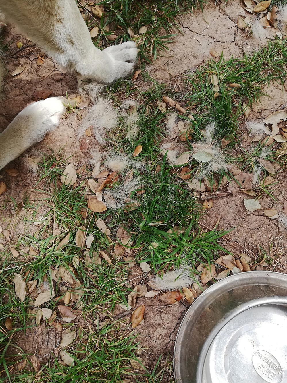 Dit is echt een teken dat de winter achter de rug is. Karma begint haar wintervacht te verliezen. Nu nog een klein beetje, straks met dikke plukken tegelijk. Normaal blijven de plukken een beetje aan haar hangen, maar deze zijn er spontaan afgevallen. Of ze heeft zich liggen schurken.