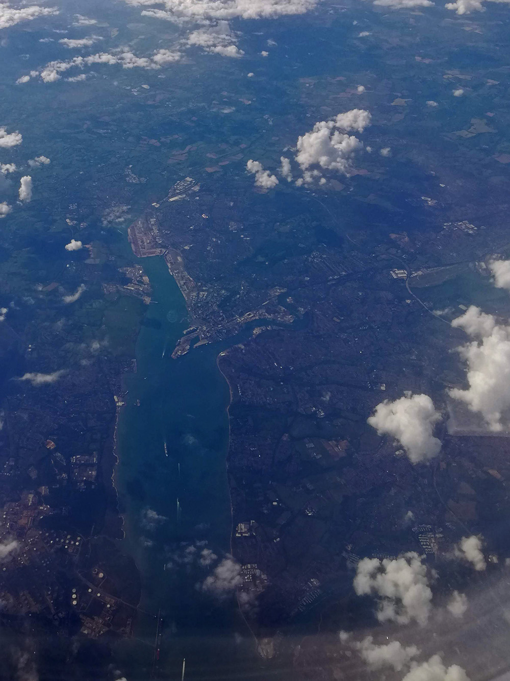 Doordat het erg druk was in het luchtruim boven Frankrijk was er besloten om te vliegen over Engeland. Door die omweg hadden we wel een mooi plaatje van Engeland uit de lucht. Je kon zelfs even de White Cliffs of Dover zien. Nou ja, je kon witte rotsen zien uit zee. Kan ook heel ergens anders geweest zijn. Deze rivier met iets van een haven was ook goed te zien. Iemand een suggestie waar dit precies is?