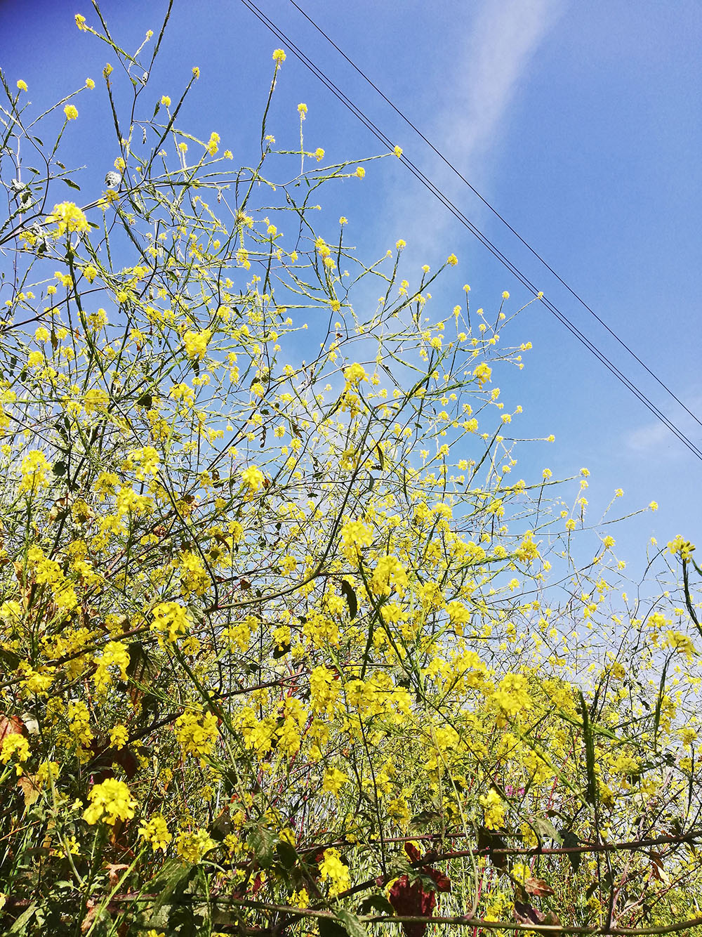Het is ongelooflijk, hoe hoog het koolzaad komt, als je het z’n gang laat gaan. In de bermen van het weggetje worden het kolossale planten. Ze zijn wel ielig, maar erg hoog. Sommige halen de drie meter wel. In Engeland zie je hele velden met het spul, maar dat is gecultiveerd en dat wordt niet zo hoog als dit. Hier is niets gecultiveerd aan, het groeit en bloeit waar het maar wil en het geeft een prachtige gele deken over het land. Het staat nu zo hoog dat je aan één kant tegen een gele muur opkijkt. Hierdoor is het weggetje een stuk intiemer geworden. Aan de andere kant van het weggetje is er net gemaaid. Aan die kant kun je weer gewoon over het weiland kijken.