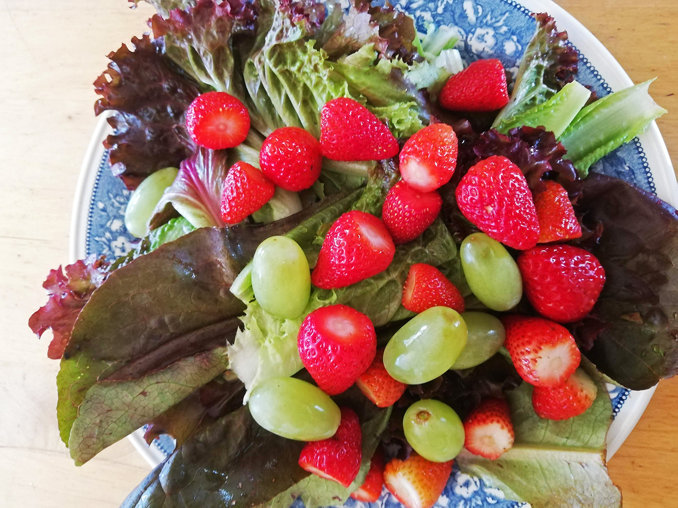 Het is te warm om te koken. Buienradar zegt dat het 25°C is, met als gevoelstemperatuur nog eens twee graden hoger. Koken doen we dus even niet, maar eten wel. Het grootste gedeelte komt uit eigen tuin. Twee soorten sla en aardbeien. De druiven zijn van de Lidl, want die hebben we nog zelf kunne plukken. Er staan wel een paar druivenranken, maar echte druiven zijn er nog niet aan gegroeid. Op deze manier hebben we toch een lekker maaltje. De aardbeien zijn nog warm van de zon, zo vers zijn ze.