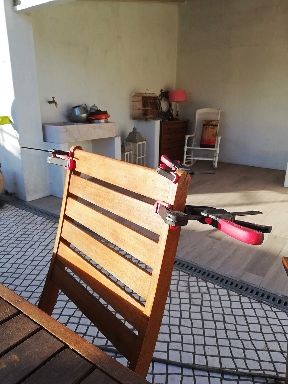 Een tijdje geleden heeft het fink gestormd in Portugal. Een van de stoelen op het terras was omvergeblazen en daarbij brak er een stukje van de staanders af. Vorige week moest de stoel verplaatst worden, hij werd bij de bovenste lat gepakt en er werd gepoogd hem een stuk verder te plaatsen. Te krachtig bleek, want er brak ook een stuk van de andere staander af en toen was de bovenste lat ook los. Gelukkig een mooie breuk, aan twee kanten. We hebben ook nog wat houtlijm in huis en het is weer prachtig gelijmd. Het is wel jammer dat er nog eens tukje ontbreekt, je blijft de breuk wel zien. Misschien moeten we dat nog vullen met iets van vloeibaar hout.
