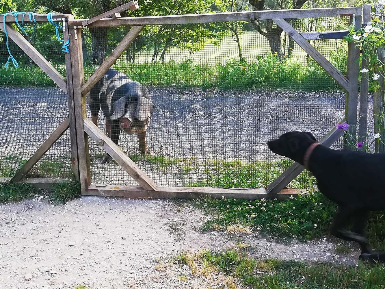 Het is vast erg moeilijk om de varkens vast te houden. Zo maar ineens staat er weer een voor de deur. Ze zijn vriendelijk en rustig en erg nieuwsgierig. Tomás heeft de eerste ontmoeting, ze staan met zijn tweeën bij het hek een beetje tegen elkaar aan te snuffelen. Van beide kanten geen angst, ze maken vriendelijk kennis. Tomás blaft wel een beetje van de spanning, het varken is er niet van onder de indruk. Ze kuiert rustig weer het weggetje af.