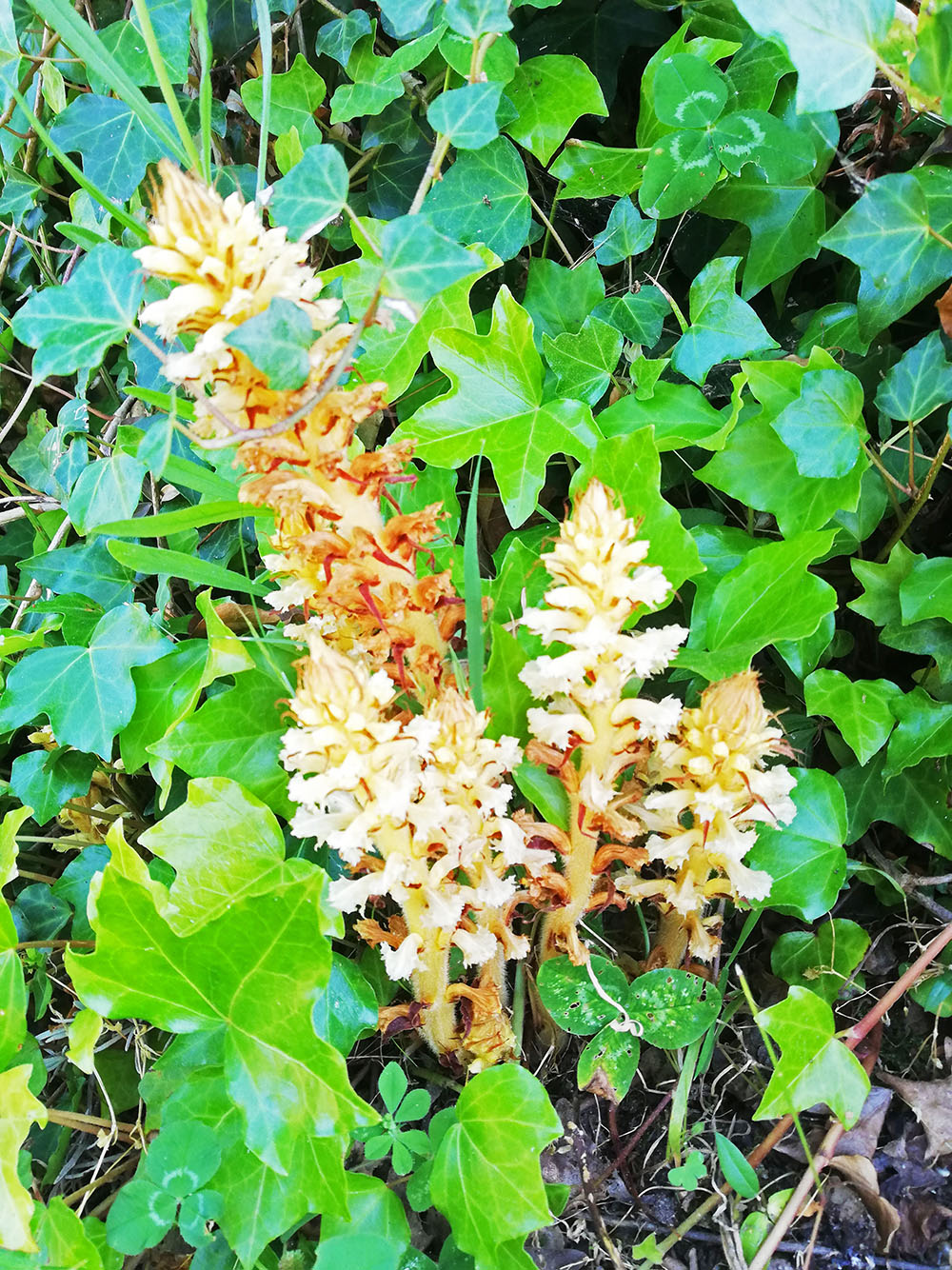 Nooit gehoord van een bremraap, kom je dat hier zo maar tegen. Het plantje staat een beetje in de berm waar veel klimop groeit. Volgens sommige foto’s op internet is het een plant die parasiteert op klimop. In Nederland is het een zeldzame soort, komt eigenlijk niet voor, maar hier groeit het als een wilde plant. Gek genoeg heeft het geen Portugese naam, althans die hebben we niet gevonden. Hij staat bij Manuela voor bij haar muurtje, maar zij kende de plant verder ook niet. Het is ook geen verschrikkelijk bijzondere plant. De bloem heeft iets van een leeuwenbek maar dan met de tros in de vorm die in de verte op een hyacint lijkt. Moeilijk om te zeggen of het een mooie plant is, maar bijzonder is het wel.