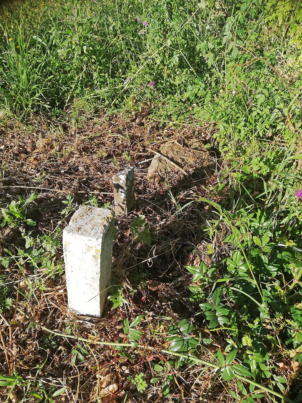 Grenspaaltjes zie je wel vaker. Een stuk land wordt van dat van de buurman afgescheiden door paaltjes te plaatsen. De lijn tussen de paaltjes is dan de grens. Vroeger werd dat gedaan door stenen te leggen en iedereen wist welke steen bedoeld was om de grens aan te geven. Later werden er paaltjes in de grond geslagen om het aan te geven en als die paaltjes wat onopvallender worden dan wordt er een nieuwe bijgezet. Langs het weggetje kun je de drie generaties mooi naast elkaar zien. De steen ligt er nog en het paaltje en als laatste het wit geschilderde betonnen paaltje dat lekker opvalt. Dat het werkt kun je wel zien. Het terrein aan de linkerkant van het paaltje is onlangs gemaaid en aan de rechterkant is het nog een bonte wildernis.