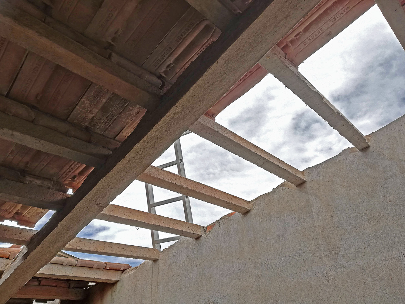 Als het hard regent stroomt er water langs de muur van de geitenstal. Er is ergens een lek in de pannen. Moeilijk te zien waar het precies zit, maar je kunt wel zien dat de pannen schots en scheef liggen. Er zijn verschillende maten pannen gebruikt waardoor het niet overal lekker aansluit om het maar eens eufemistisch te zeggen. Als het regent kun je het dak niet repareren, maar het is nu lekker zonnig én we hebben hulp. Samen met Pieter hebben we de pannen van het dak gehaald en de laatste rij van de muur losgebikt. In Portugal wordt de buitenste rij bijna altijd in het cement gelegd. De rest van de pannen houden elkaar wel goed vast, maar de laatste is gevoelig voor wind. Vandaar.