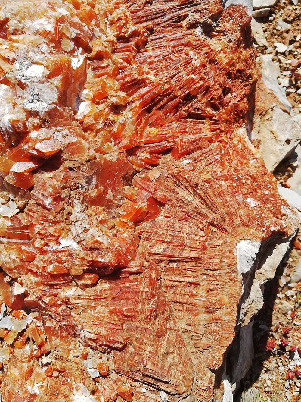 Rond het afgezette gedeelte kun je nog wel veel stenen met kristallen zien. De meeste oranje zoals deze op de foto, maar hier en daar een witte. Er is al veel weggehaald, vorige keer lag er veel meer. De stenen op zich zijn erg mooi om te zien, soms net glas. Op sommige stenen kun je duidelijk fossiele afdrukken zien, niet zo spectaculair als die in het midden van het gebied tussen de hekken. Maar de wetenschap dat de fossielen zo’n 170 miljoen jaar oud zijn, maakt het wel weer indrukwekkend.