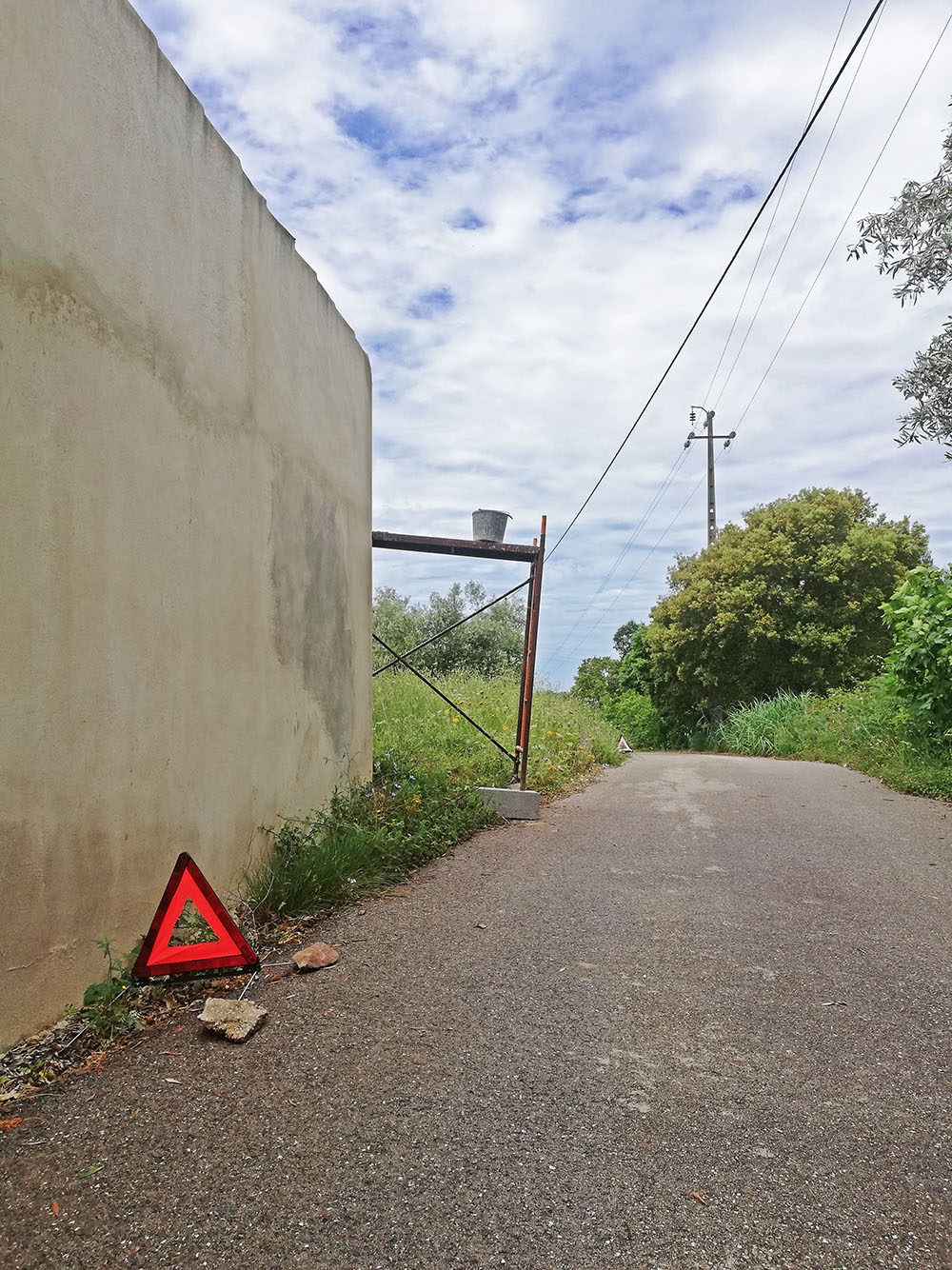Om de hoek van de stal te kunnen repareren moeten we er wel bij kunnen. Bovenin is een stuk afgebroken bij het losbikken van de dakpannen. De pannen liggen er weer op en nu kunnen we de hoek herstellen. De steiger moet dan een beetje op de weg staan. De berm is een stuk hoger dan de weg, er moeten daarom ook wat stenen komen ter ondersteuning. ´t Staat nog niet helemaal recht maar het is om te doen. De ondersteunende steun steekt dan wel een beetje uit. Overdag is het wel te zien, maar het is allemaal niet in één dag te doen, het moet dus ´s nachts blijven staan. Om het beter zichtbaar te maken en in ieder geval om te waarschuwen hebben we de gevarendriehoeken van de auto´s erbij gezet. Er komt wel bijna niemand langs, maar het zal maar gebeuren dat iemand net de steen met zijn wielen meeneemt en de hele steiger omtrekt. Op deze manier lijkt het wel veilig genoeg.