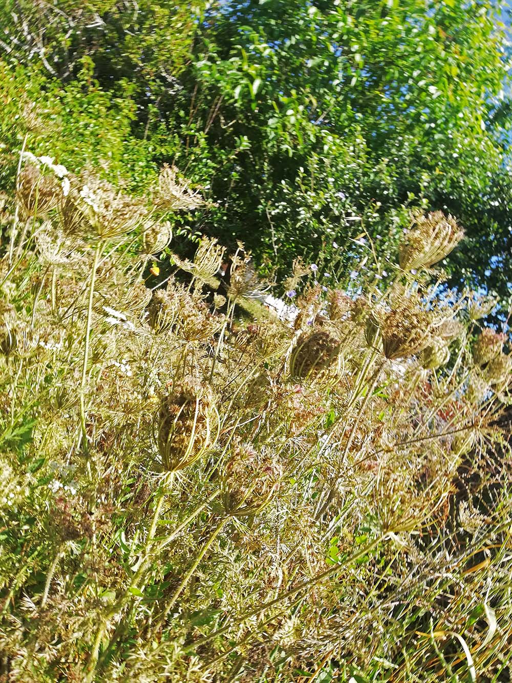 Het hele terrein staat vol met witte bloemen, die nu wel een beetje op het eind zijn. Het lijkt op Fluitenkruid, maar het is het toch niet. Als de plant uitgebloeid is komt er een soort doos op met zaad. Zodra het zaad een beetje droog is kunnen we gaan maaien, want de bijen hebben er niets meer aan. Officieel heet de plant Daucus carota subsp. maximus, de Portugese naam is Cenoura-Brava oftewel Wilde Wortel, of Wilde Peen. Komt vrij veel voor, ook in Nederland, dus het is geen zeldzaamheid. Dit is wel de variant met maximus in de naam, doordat deze vrij groot kan worden. De Nederlandse variant wordt hooguit een meter, maar deze haalt makkelijk anderhalf.