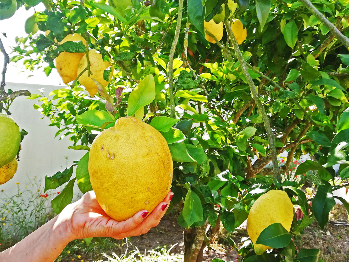 De boom hangt nog steeds vol en er zijn alweer bloemen te zien. ´n Soort continue aanvoer van citroenen.