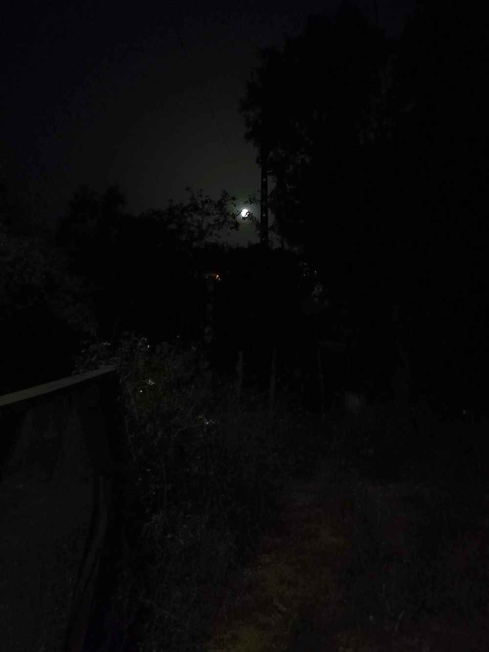 Er was een supermaan beloofd, zo eentje die als een enorme bol aan de horizon zou hangen. ’t Viel een beetje tegen, het kwam ook wel doordat toen de maan opkwam er nogal wat bewolking was, pas later op de avond trok die weg en was de maan zichtbaar. Hij staat op de foto nog niet zo hoog, dus nog niet zo lang op, maar spectaculair groot is het nou ook weer niet. Het blijft wel een mooi gezicht, die maan die door de takken schijnt, en de boel verlicht. Als de maan vol is en hoog aan de hemel staat is het gewoon licht buiten.