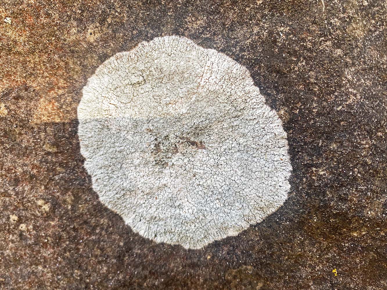 Op de stenen zitten, zeker aan de buitenkant, grote vlekken. Gele, witte en zwarte. Die vlekken zijn korstmos hebben we begrepen van Ad die daar op IJsland veel over geleerd heeft. Een korstmos is een bijzonder iets, het is niet één wezen of één plant, maar een symbiose van een schimmel en een alg. De alg maakt met behulp van zonlicht voedsel voor de schimmel en de schimmel zorgt voor vocht voor de alg en beschermt de alg tegen te felle zon en vraat. Perfect samenspel.
