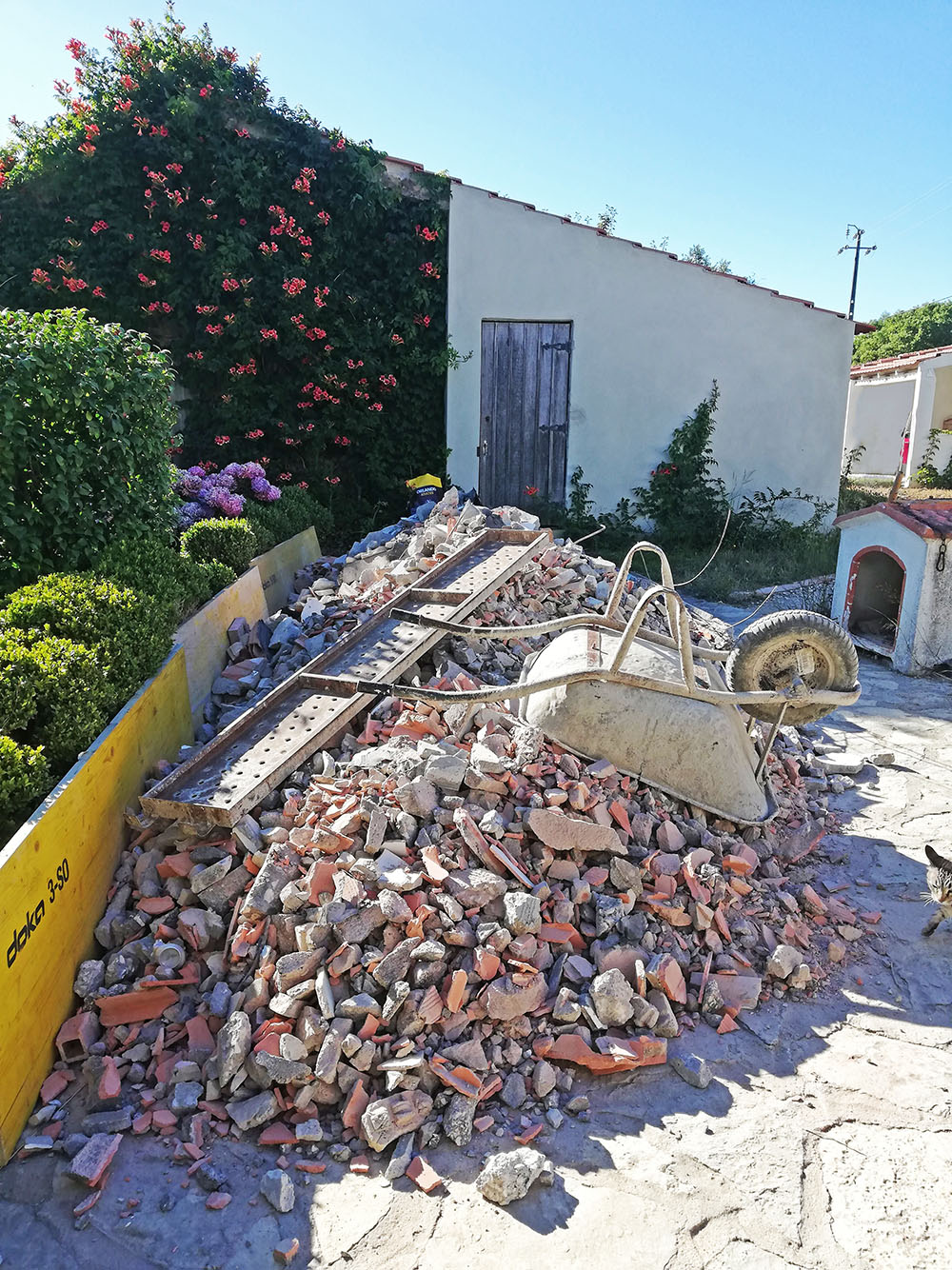 Onvoorstelbaar wat een puin er uit zo´n appartement komt! Deze hele puinhoop is van het plafond in de badkamer en van de schouw. En dan nog een beetje van de deurposten die vergroot zijn. Er ligt zo voor onmogelijk te tellen aantal kruiwagens. De mannen hebben flink heen en weer gelopen met de kruiwagen. We dachten nog even het puin te bewaren voor als straks het terras gebouwd gaat worden, maar deze hoeveelheid is een beetje teveel van het goede. Gelukkig wordt het allemaal afgevoerd en hebben we straks weer een leeg pleintje. Vooralsnog moet Karma het met een beperkte slaapplaats doen want de berg ligt tot bijna in haar hok.
