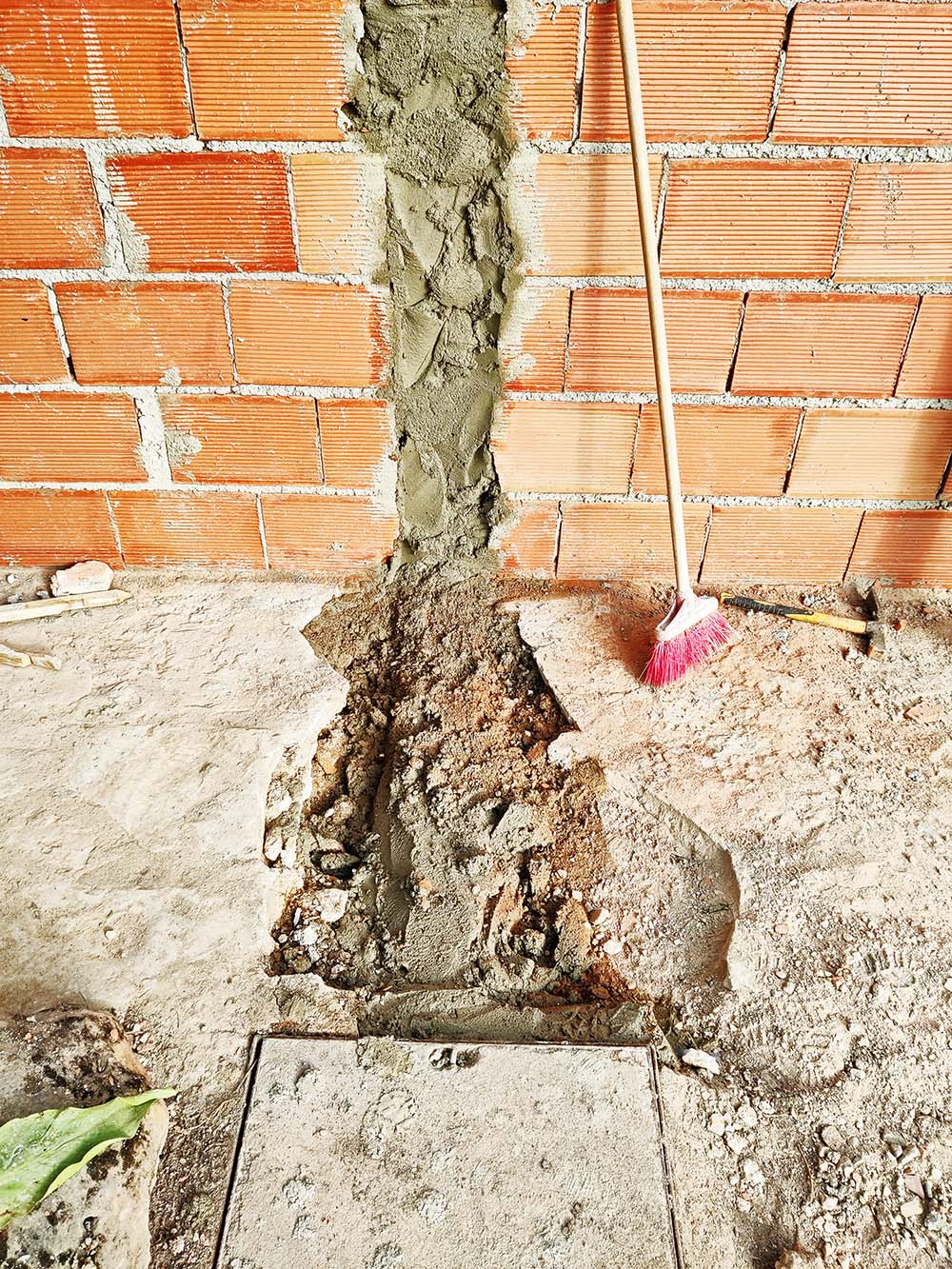In de net gemetselde muur is een gleuf gehakt en in die gleuf is de afvoerbuis voor de zolder aangelegd. Voor eventueel de badkamer en voor de wasmachine en de droger. Zwart water noemen de Belgen dat.