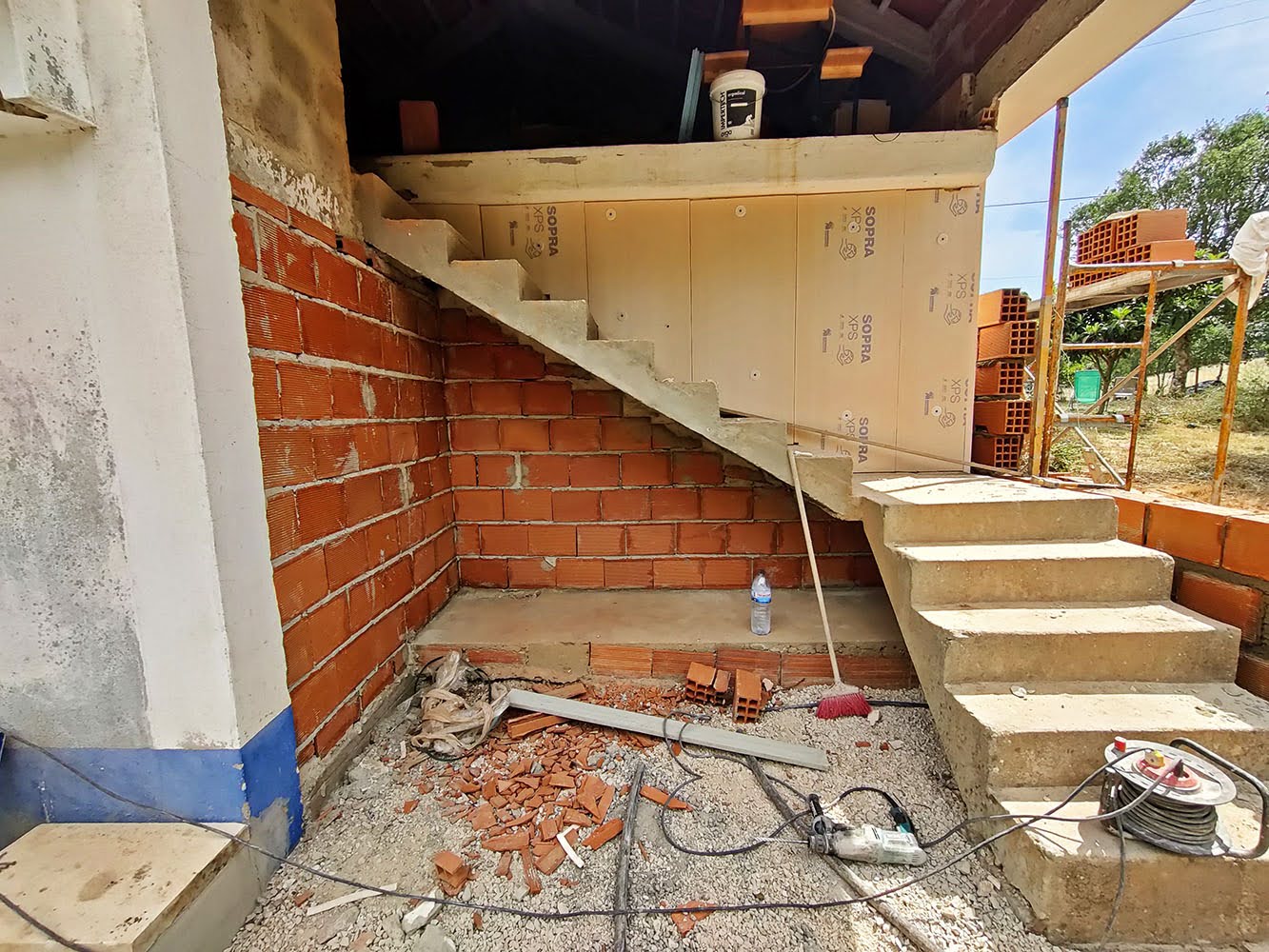 Eigenlijk zouden we de isolatie van de kopse kant van het appartement aan de binnenkant doen, met wat dunner materiaal, maar dan zouden we hoe dan ook de ruimte een beetje kleiner maken. Toch maar besloten het aan de buitenkant te doen. Het trapje wordt dan optisch iets smaller, maar praktisch maakt het niet zo veel uit. Het trapje zat bijna twintig centimeter onder een soort van balk en die ruimte is nu gebruikt om de extra muur met isolatie neer te zetten. Is ook meteen die lelijke muur weg waar nog wat loze leidingen zaten van de gasfles en de elektriciteit. Er heeft een stoppenkast gezeten, ooit, maar een stoppenkast direct naast een gasfles is niet zo’n goed idee. Die stoppenkast zit nu in het motorhuis waar de elektrische pomp zit die voor de waterdruk in het huis zorgt. En voor de zekerheid zijn we ook maar van het gas gegaan.