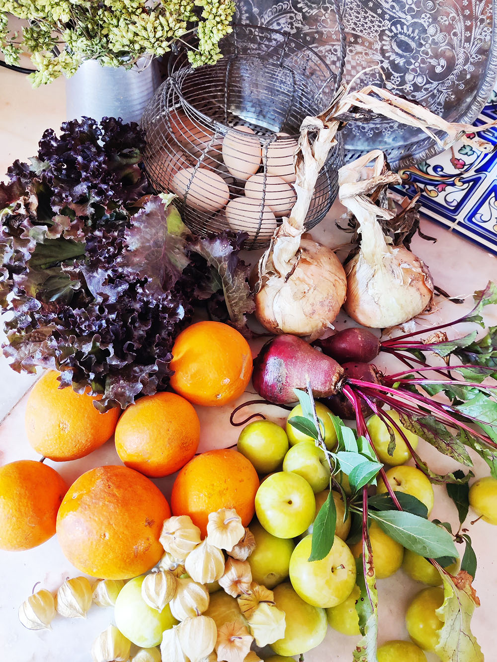 Er wordt hard gewerkt aan het appartement. Ondertussen wordt er ook flink gewerkt aan de moestuin en die begint lekker op te leveren. Een hele oogst! Sinaasappelen, physalis, uien, pruimen, bietjes, krulsla en de kippen doen ook hun best en leveren eitjes. Alles bij elkaar een bonte verzameling vers. Tel daarbij op de oregano, die dan wel niet van eigen tuin is, maar geplukt in het wilde stuk niemandsland tussen Morgado´s eucalyptusbomen en het kurkeikenbos achter ons en we hebben echt van alles wat.