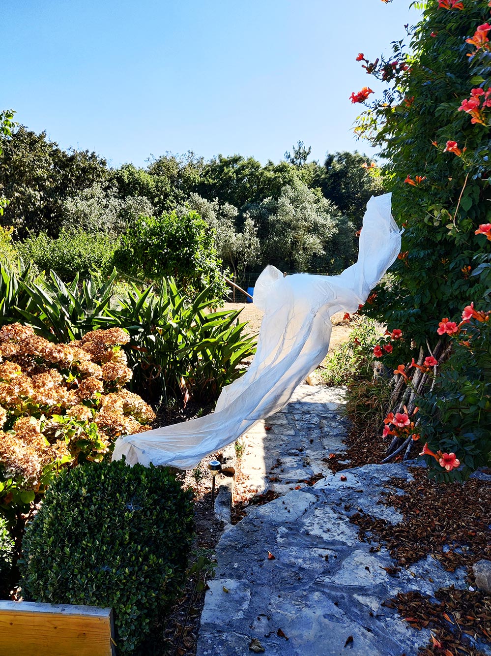 Het is net of het spookt. Tussen de struiken hangt een figuur te dolen. Door de wind beweegt het ook nog eens aan alle kanten. Alsof de witte wieven gearriveerd zijn. Vooral ´s avonds als het al donker is en je ´t allemaal niet zo goed kan zien is het spookachtig als je niet beter weet. Het is jammer genoeg allemaal wat trivialer. De mannen laten allerlei materiaal aanrukken en veel van dat spul is verpakt in plastic. En als dan de wind er vat op krijgt gaat dat een eigen leven leiden en verspreidt het zich brutaal over het terrein. Gelukkig blijft het wel in de bomen of de struiken hangen anders kon je er nog achteraangaan ook.