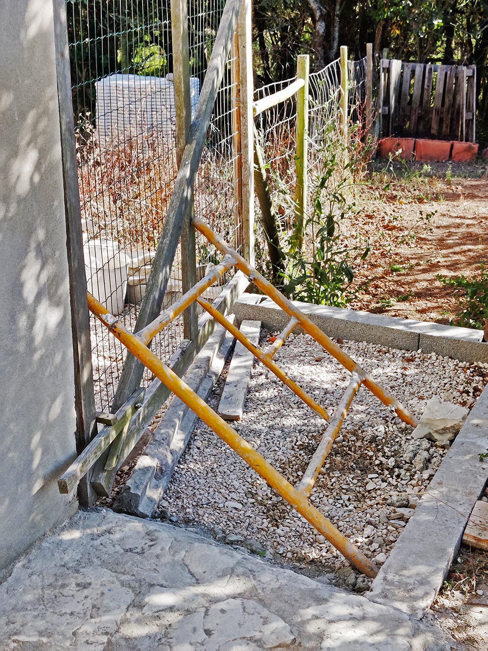 De muur van het appartement is gestuukt. Maar ja, daar zaten de houten beugels op waarmee het tussenhek werd vastgehouden. Er zitten op het hek twee stukken hout, die als een soort hengsel werken en waarmee het hek dichtgehouden werd, opdat de honden niet van het voorterrein naar het achterterrein kunnen. Op het achterterrein lopen de kippen vaak los en de combinatie honden en kippen is niet altijd de meest gelukkige.
