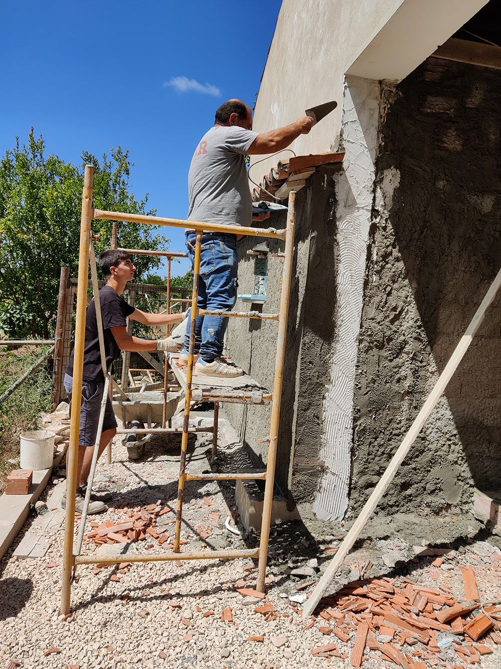 Waar nu het appartement is, is waarschijnlijk vroeger een soort van afdakje geweest om hout op te slaan of iets dergelijks. Er is nog een stukje van het dak te zien, er steekt een rij pannen uit de muur die met een soort betonnen balk ondersteund werd. Nu we hebben besloten dat de muurisolatie buiten wordt aangebracht en er een terracotta stenen muur voor komt, is die balk overbodig, nou ja niet overbodig, hij valt nu gewoon in de muur het wordt wat meer één geheel. We hadden de pannenrij ook weg kunnen halen, maar dan had de voorzetwand over de hele gevel gemoeten en dan krijg je weer problemen met de dakpannen van het dak. Dit is wel een mooie oplossing. De pannenrij wordt iets langer en komt gelijk met de dwarsmuur, waar hij voorheen zomaar ergens stopte. Binnen is van het voormalige afdakje niets meer te zien en het is ook eigenlijk overbodig, maar het geeft net even wat.