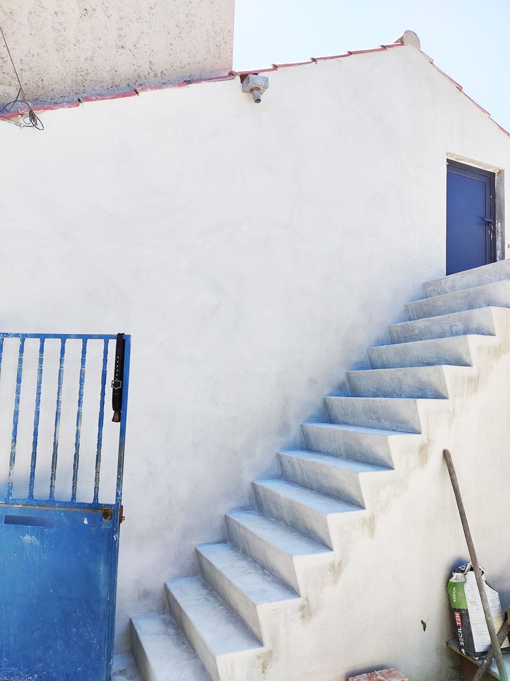 Wat ziet dat er een stuk mooier uit zeg. De muur bij de trap is onder het afdak al een keer gedaan door Ilídio en Joaquim en nu is het gedeelte erboven ook gladgetrokken. Alle beschadigingen, putjes, barsten en halfbakken reparaties zijn weggewerkt. De kabelhoudertjes van allerlei kabels die er ooit hebben gelopen zijn verwijderd. Wat knapt dat op zeg als er een nieuwe stuclaag op zit. ’t Moet allemaal gedaan worden voordat er geverfd wordt, want anders zou je een beschadigde muur verven. Dat verven laat nog wel even op zich wachten, want we willen eerst het terras aan de voorkant gedaan hebben. Voor je het weet zit anders de net geverfde muur onder de cementspetters.