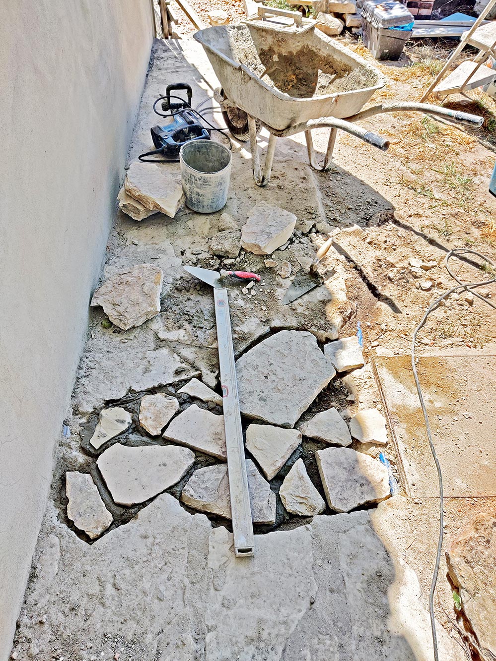Voor de nieuwe afvoer van het appartement, of eigenlijk van de ruimte boven het appartement, moest een doorgang worden gemaakt door het pad. Altijd jammer want het was zo mooi gelegd. Op ons verzoek hebben de mannen geen sleuf geslepen, dwars door de stenen heen, maar hebben ze de stenen met een stevige klopboor losgehaal Nu kunnen we het gat min of meer onzichtbaar dichten zonder dat je die rare rechte breuklijnen ziet. Daarna moet alles weer netjes in elkaar gemozaiekt worden en het moet zo liggen dat we niet ineens van die struikelsteentjes hebben. Dat is nog een heel puzzelwerk, maar het lijkt goed gelukt. Als het cement is uitgehard kunnen de voegen gedaan worden en je ziet er bijna niets meer van.