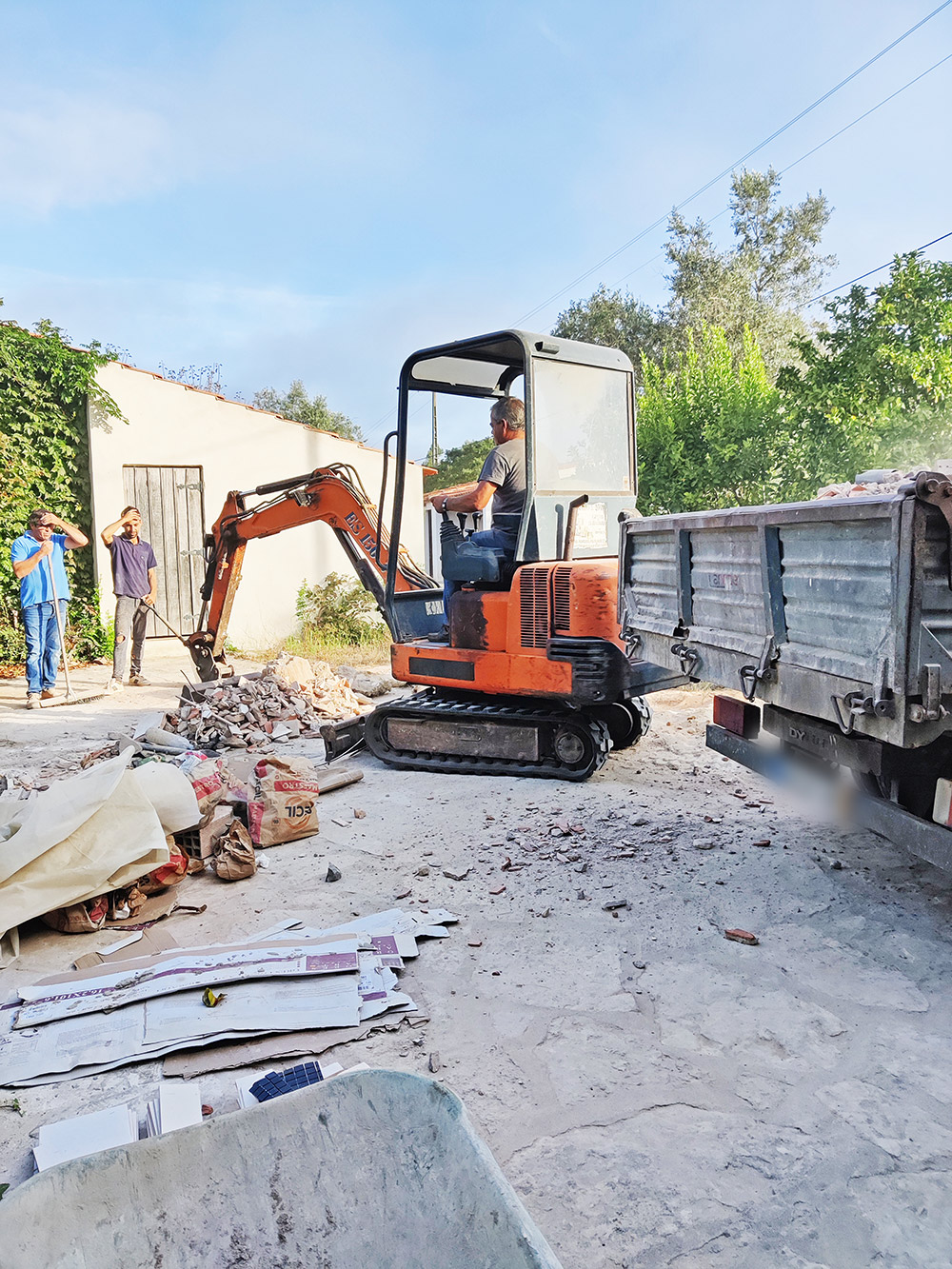 En er wordt weer geruimd. ’t Voelt altijd erg lekker als de bende weer weggewerkt wordt. In de loop van de werkzaamheden ontstaat er van alles aan troep. Brokken steen, lege cementzakken, van alles. Als we dat zelf weg zouden moeten brengen zouden we weken, misschien wel maanden bezig zijn, maar met zo’n graafmachientje en een soort grote pick-up gaat het lekker snel. En vaak wordt het puin dat bij het ene werk ontstaat weer gebruikt bij een ander werk, als bodem voor een fundament of zo.