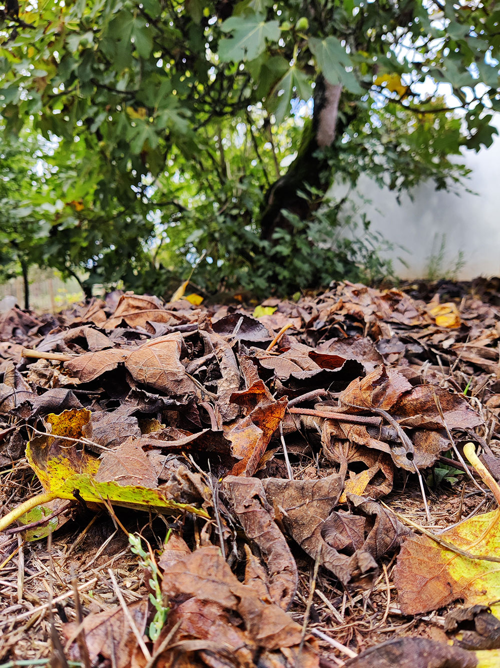 Het is nog een week voor de equinócio, de dag dat de herfst officieel begint maar onze vijgenboom trekt zijn eigen plan. Er valt al heel wat blad op de grond. De droogte van de afgelopen maanden heeft hier ook wel bij geholpen waarschijnlijk. Er zit nog genoeg aan de boom, het is nog best groen, maar de grond is al bezaaid. Het is wel grappig dat de geiten verzot zijn op de gedroogde bladeren van de vijgenboom, Ze houden ook wel van een groen blaadje, al zijn het geen oude bokken, maar de bruine dorre vinden ze ook erg lekker. ’t Knispert ook als ze het eten. Misschien wel het geitenequivalent van de chips die wij dan weer eten als we naar de televisie kijken?