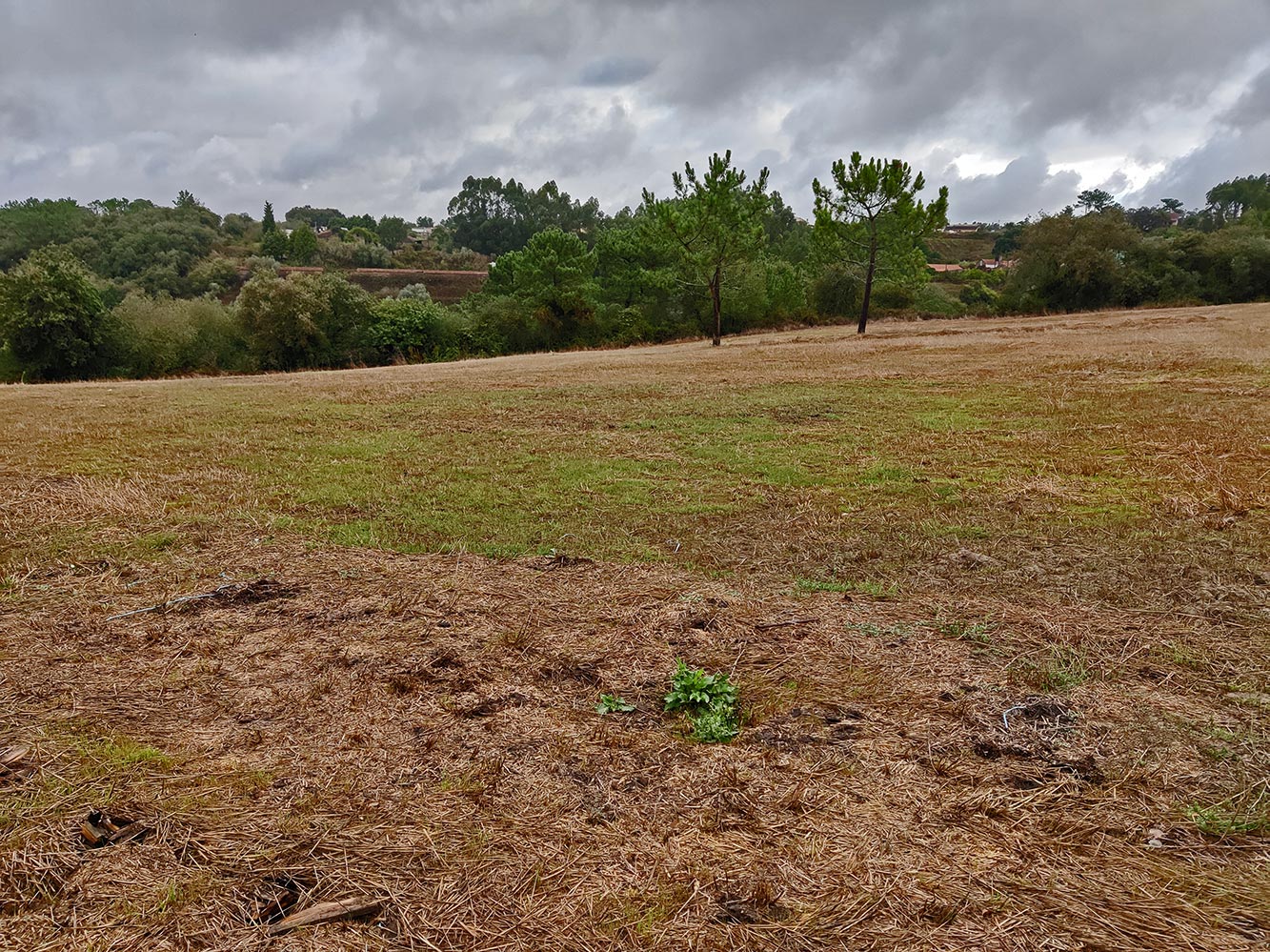 Het is nog maar een paar dagen geleden dat de droogte van maanden eindigde. De velden aan de overkant van het weggetje waren helemaal geel en gortdroog. Het leek of alles dood was. Gelukkig is dat niet zo, na een paar dagen regen begint er alweer een groene zweem te komen. Zo snel kan het gaan. Nog even en het gras staat weer te wuiven.