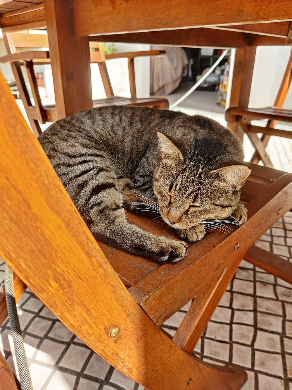 Ziva lijkt te denken ‘weggegaan is plaats vergaan’, want ze ligt prinsheerlijk in de herfstzon op een stoel van het terras, alsof ze vindt dat als zij naar Nederland gaan ze wel op die plaats mag gaan liggen, bij afwezigheid van anderen.
