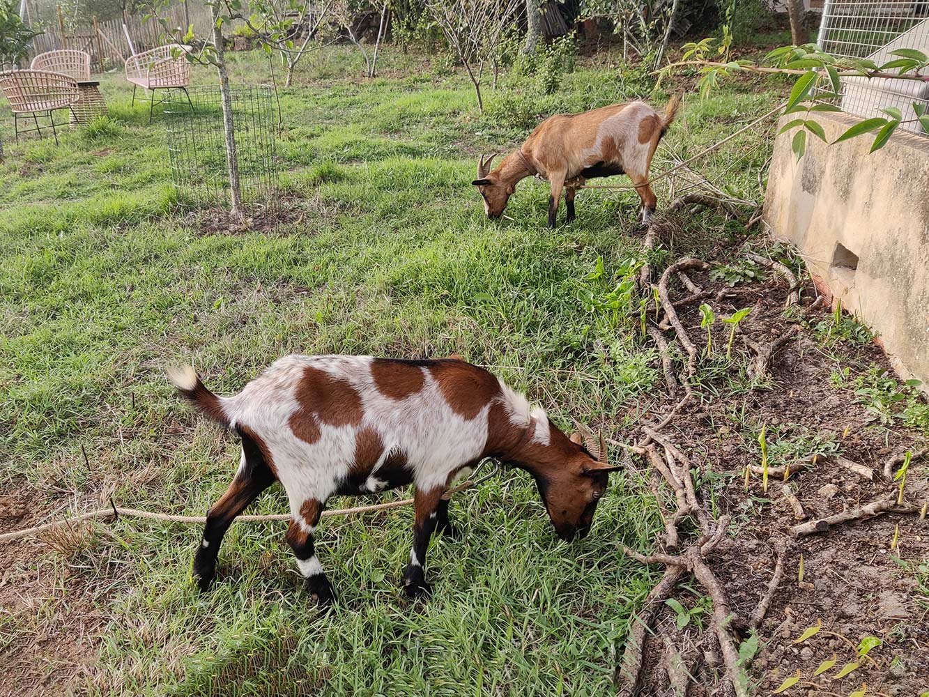 Soms worden de geiten ergens anders dan in het bos te werk gezet. Overal groeit wel gras en ander spul en het is lekker als ze daar even hun best op kunnen doen. Je moet alleen ontzettend uitkijken, want ze zijn altijd op zoek naar iets wat nou weer net niet de bedoeling is. Beatriz en Ines staan hier vrolijk van het gras te eten, maar even verder heeft Isabel de top van de jonge kersenaanplant versnaperd. Ze doet dat nogal destructief. Ze gaat tegen het boompje staan zodat het naar beneden buigt en ze bij de jonge blaadjes kan. Helaas is het boompje nog niet op krachten en dan heeft het jonge stammetje de neiging af te breken. ’t Loopt allemaal wel weer uit hoor, maar het is zonde.