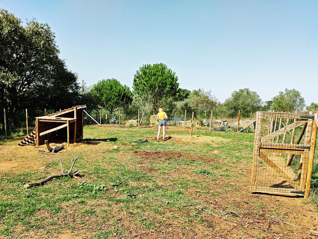 Aan het eind van de zomer, als het te koud wordt voor de geiten om ’s nachts buiten te staan, is het tijd om de kraal winterklaar te maken. Gedurende de zomer worden er heel wat geitenkeutels geproduceerd, zeker nu we drie volwassen geiten hebben. Te veel van dat goedje is niet zo goed voor de bodem, dus het wordt verzameld en gaat op de composthoop. Ook de takken die nog rondslingeren van het snoeiwerk dat de geiten verorberd hebben wordt verzameld en als er genoeg is wordt Hector geactiveerd, zodat dat ook op de composthoop kan. Het hooi dat we als bijvoer geven hebben ze ook verspreid over de wei en als er te veel op één plek ligt wil daar niks anders meer groeien. Komt mooi uit want dat spreiden we dan uit op een plek die over niet al te lange tijd moestuin gaat worden. Zo wordt het onkruidvrij maken lekker makkelijk.