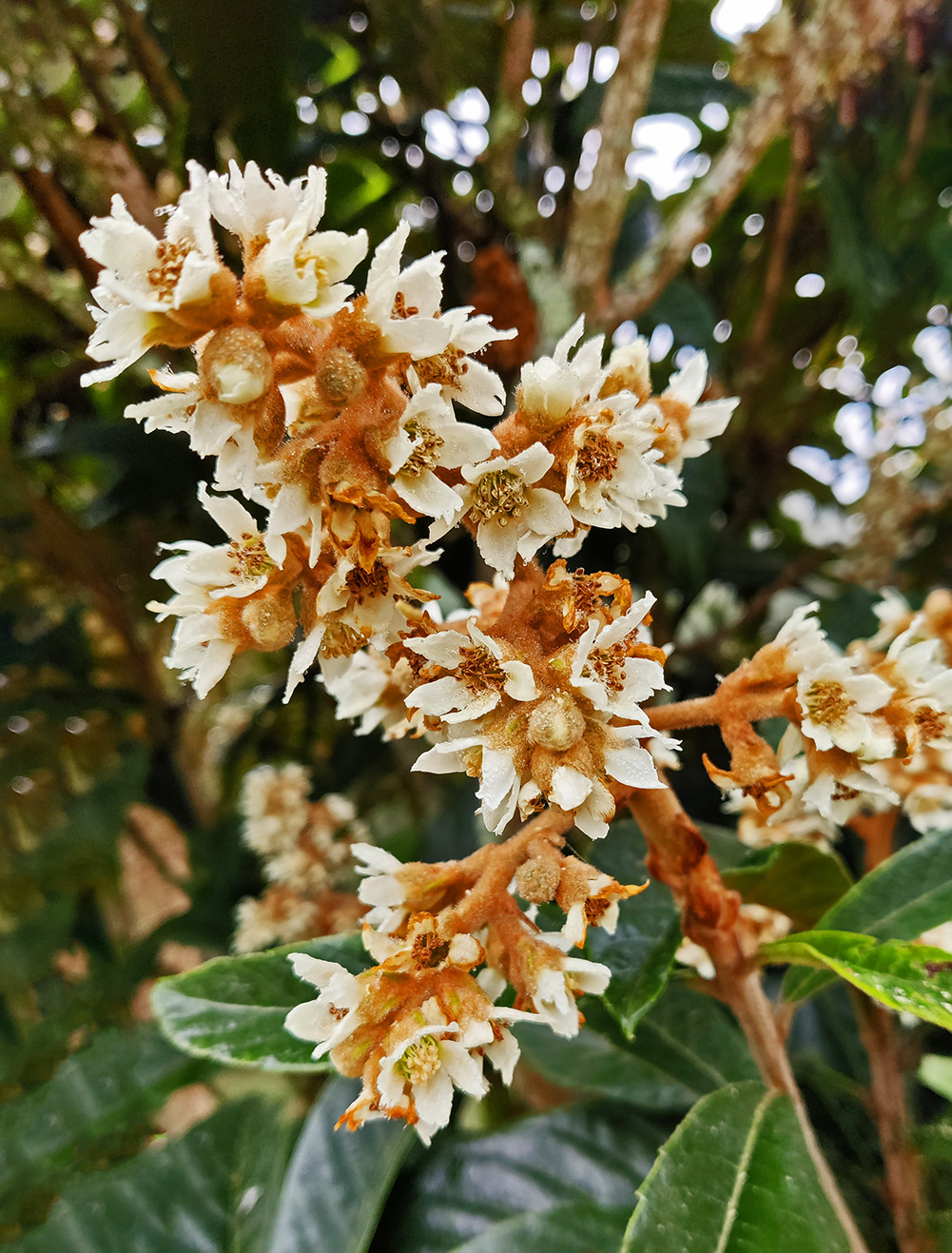 De nespereira staat bekend als de eerste boom die in de lente vruchten krijgt. We hebben er al eens over geschreven. Om vroeg vrucht te kunnen dragen moet de boom ook vroeg bloeien en dat doet-ie nu. De meeste bomen zijn bezig zich voor de winter klaar te maken, ze verliezen hun blad of laten de laatste vruchten los. Zo niet deze boom, die neemt nog even een eindspurt en staat flink te bloeien. Kunnen we van het voorjaar weer lekker van de vruchten genieten. Het belooft een goede oogst te worden als je ziet hoeveel bloemen er aan de boom zitten.