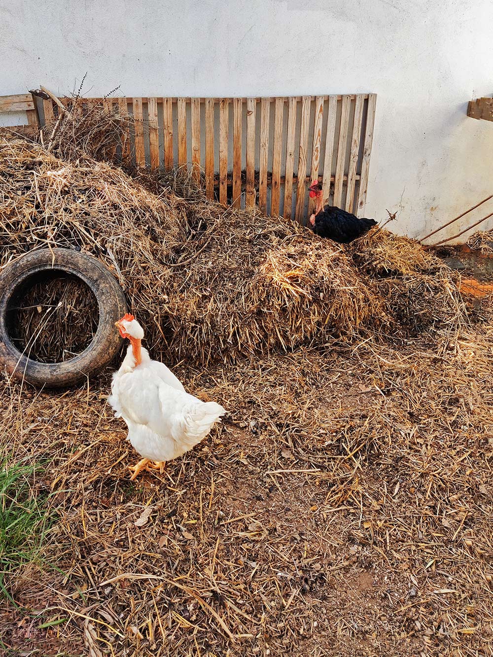 ’s Middags laten we ze vaak los, zodat ze lekker over het terrein kunnen scharrelen. De composthoop naast de ren, vinden ze bijzonder interessant. Lekker dicht bij huis zullen ze denken. De hoop halen ze wel steeds helemaal uit elkaar, waarschijnlijk op zoek naar de wormen en de torretjes die erin huizen. Kunnen wij er ’s avonds weer een echte berg van maken.