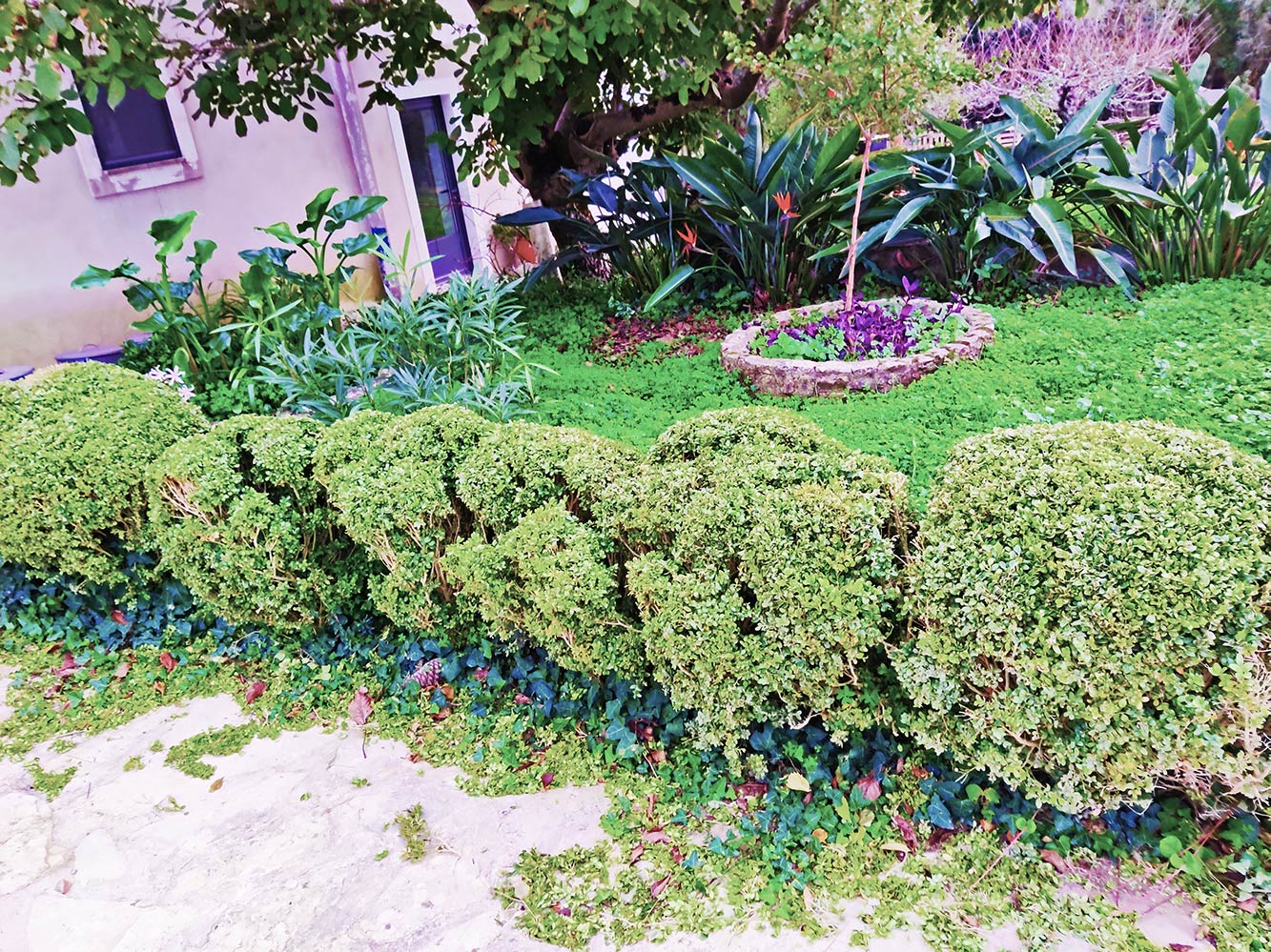 De buxusstruiken hebben een aardige klap gehad. Wekenlang heeft er een berg zand tegenaan gelegen. Weliswaar met een schot hout ertussen, maar veel licht kregen ze niet. De stapel dakpannen van het dak van het oude huis heeft er een tijd gestaan. Hierdoor waren de struiken aan één kant helemaal kaal. Het begint nu weer aardig bij te trekken. Na een snoeibeurt ziet het er allemaal wat kalig uit, maar het belooft wel weer de goede kant op te gaan. Even in de winterslaap en volgend voorjaar loopt het misschien weer prachtig uit.