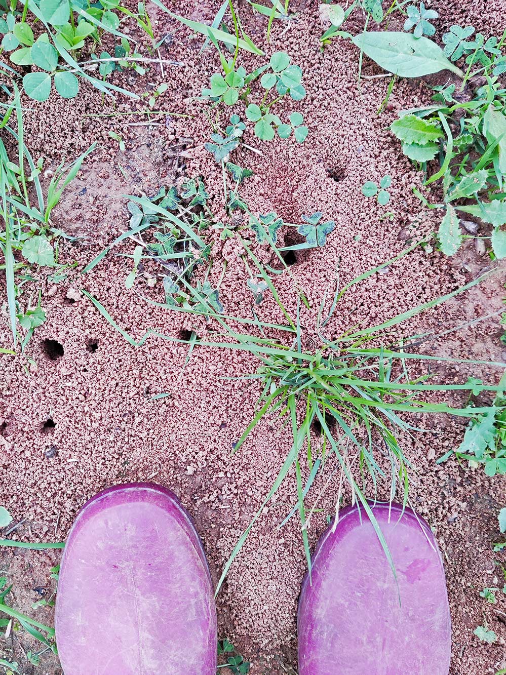 Boven de grond is het gezellig en een lekkere beestenboel met de geiten, de honden, de kippen en de katten. Onder de grond moet het ook een dolle boel zijn. Waarschijnlijk is er een heel ondergronds grottenstelsel, met miljoenen mieren. Overal zie je hele series gaten in de grond met kleine bergjes ernaast. Het zijn verschillende nesten, maar erg groot, soms zijn ze aan de bovenkant wel zo’n twee meter in doorsnede en je kunt er alleen maar raden hoe diep ze gaan. Er zijn zoveel nesten dat ze elkaar bijna raken en misschien zijn ze onder de grond nog met elkaar verbonden ook. Blijken we hier een hele ondergronds mierencontinent te hebben. Nou ja, ze doen goed werk, ruimen dode dieren op, houden de grond luchtig, Zolang ze maar buiten blijven is het prima!