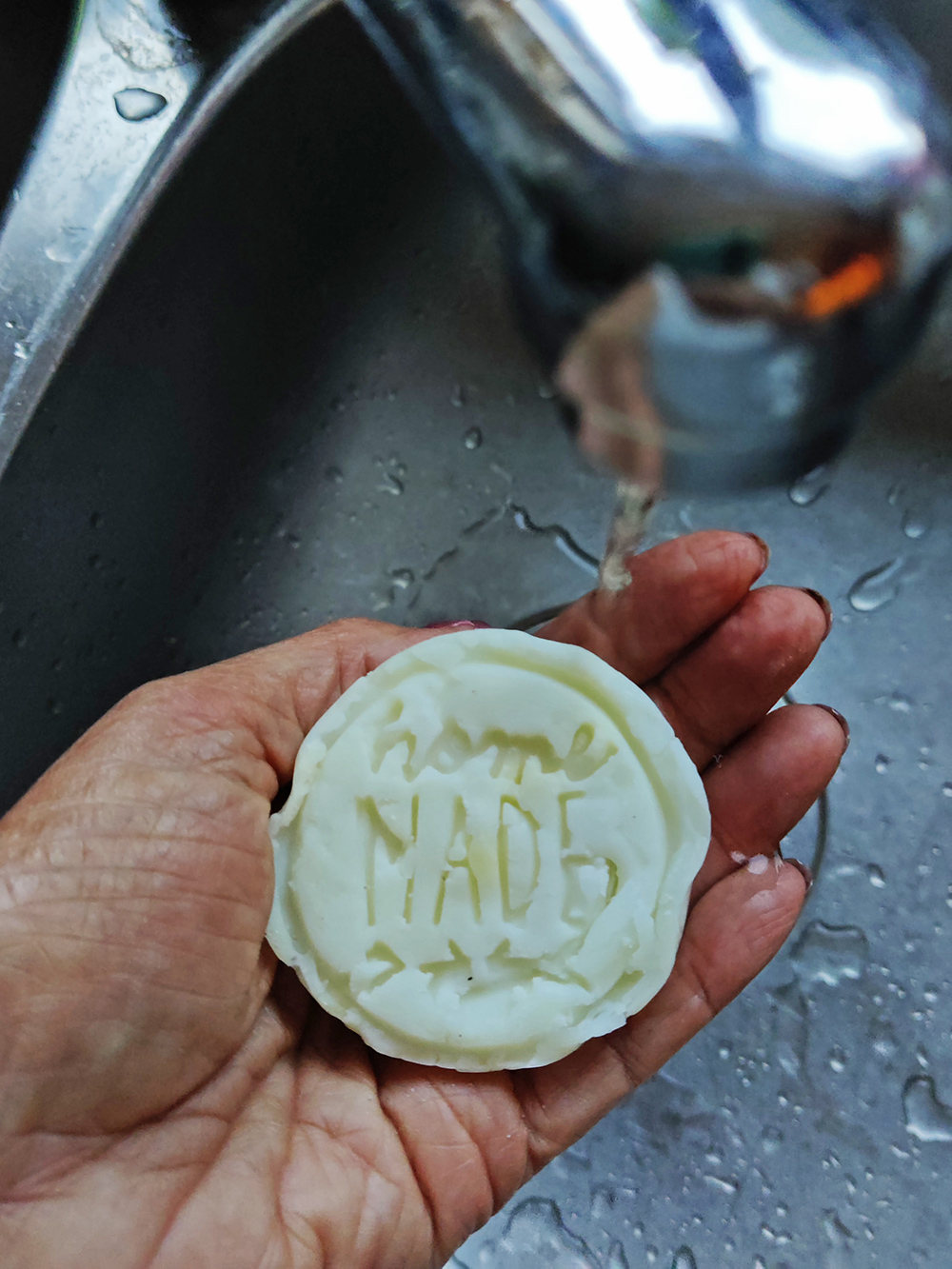 Wat is er nou lekkerder dan na een poosje flink in de tuin gewerkt te hebben even goed je handen wassen. En als dat dan ook nog zelfgemaakte zeep is dan is het extra genieten. De zeep is gemaakt van olijfolie en natriumhydroxide. Eigenlijk het spul dat ook in gootsteenontstopper zit. ´t Geeft een prachtige zachte zeep en je weet precies wat erin zit want je hebt het er zelf ingedaan. ´t Lijkt bijna of je je handen met crème hebt ingesmeerd als je ze gewassen hebt. ’t Stempel ‘home made’ is eigenlijk bedoeld voor koekjes, maar dit werkt ook heel goed.
