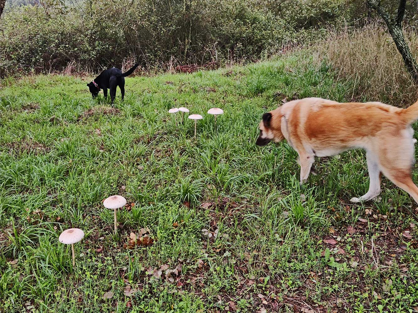 Van de meeste paddenstoelen weet je niet zeker of ze eetbaar zijn, maar van deze is het wel duidelijk. ’s Ochtends stonden er nog heel veel en ’s middags waren de hoedjes allemaal weg. ’n Snelle blik op internet leert dat het gaat om de Macrolepiota procera gaat en die is volgens de gids eetbaar alleen de steel niet. Die heeft de vinder dan ook laten staan.