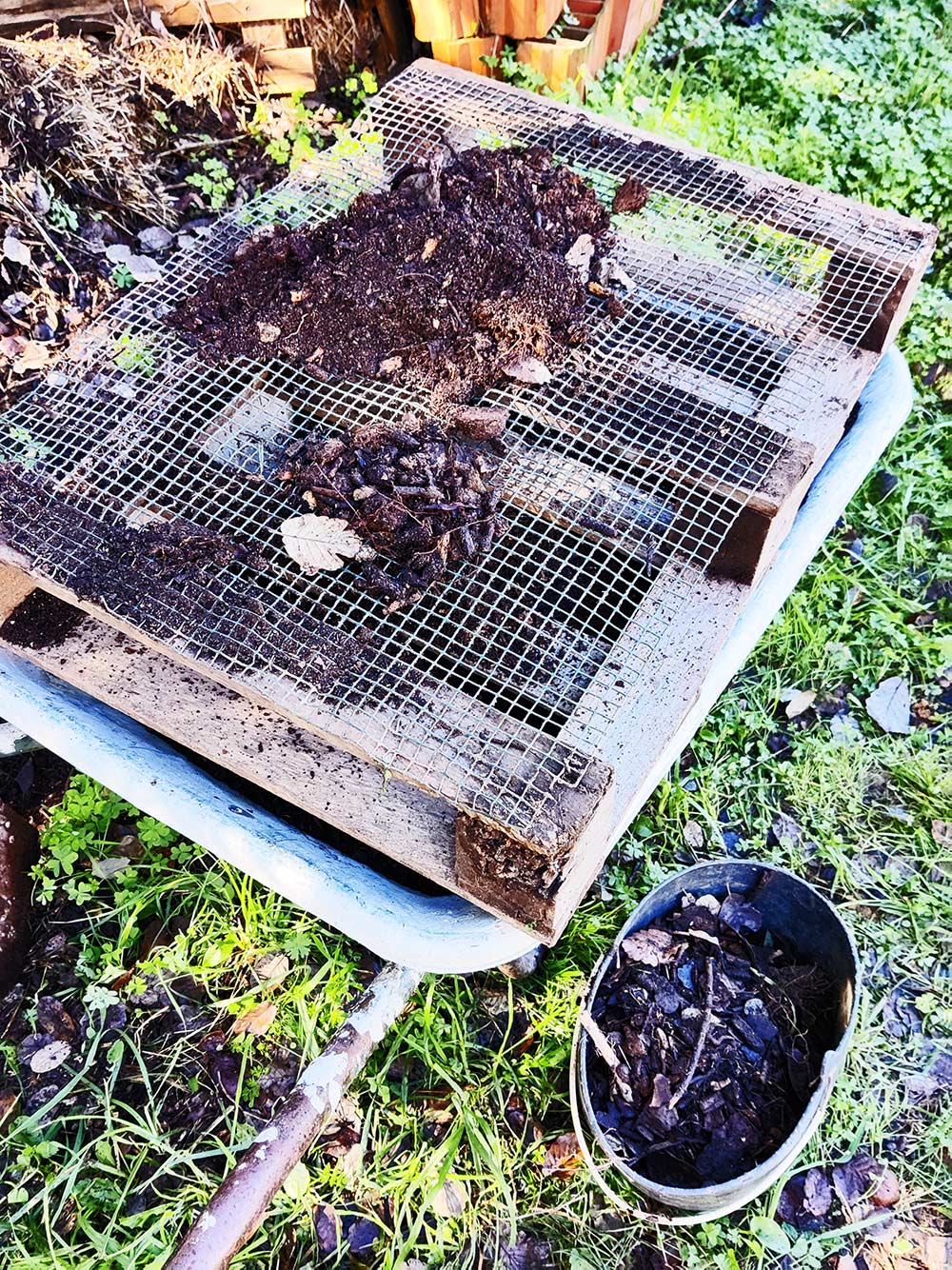 Het is de bedoeling dat op de plek van de nu geruimde composthopen een beetje degelijke nieuwe komen. Deze zijn gemaakt van aan elkaar geschroefde pallets, die houden de boel wel bij elkaar, maar het onderste gedeelte verwordt zelf ook zo´n beetje tot compost. Die gaan echt geen tweede ronde overleven.